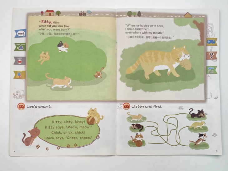 第二站是猫咪大家族,这里有四种猫咪,大橘猫妈妈说:“小橘出生的时候,小小一只,我可以衔这着它跑来跑去”。顺便去右下角帮助小猫找到自己的妈妈吧~