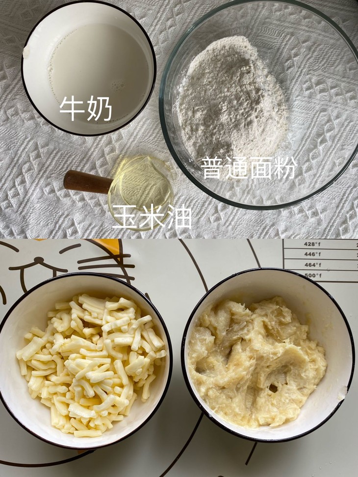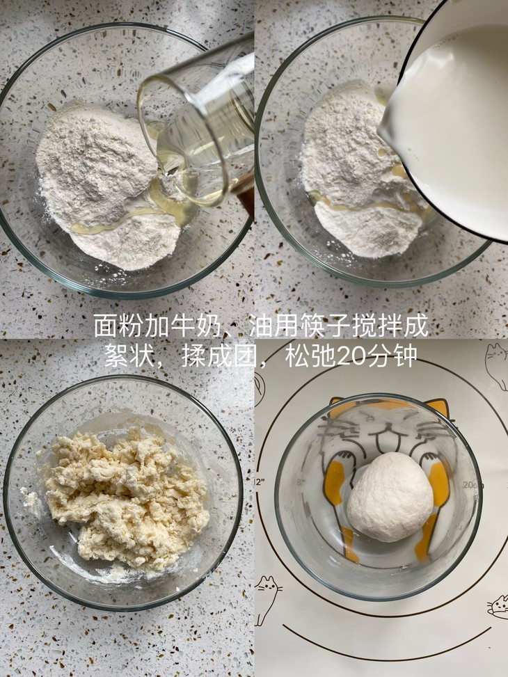 1、普通面粉加牛奶、玉米油用筷子搅拌成絮状,揉成团,松弛20分钟