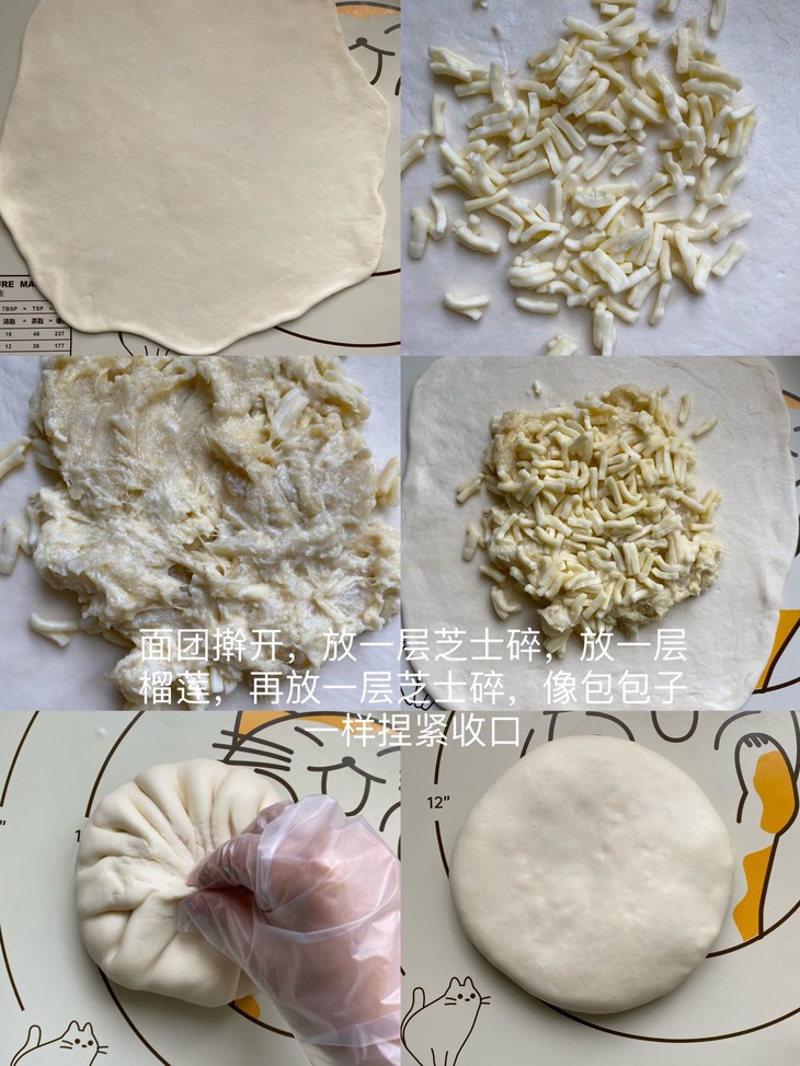 2、面团擀开,放一层芝士碎,一层榴莲泥、再放一层芝士碎,像包包子一样包起来,捏紧收口