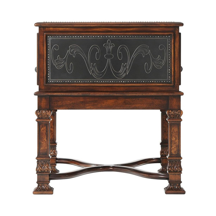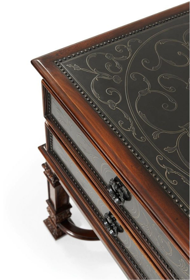 这张古典边桌黄铜蚀刻的装饰面板以及蜡雕黄铜铸造的提手太美了。材质由桃花心木和白杨木打造,桌面、柜体两侧以及两个收纳抽屉的面板均带有蚀刻的黄铜面板装饰,侧面和抽屉提手为蜡雕黄铜铸造。4支仿建筑式的桌腿通过手工雕刻而成,中间采用“X”型弯延造型,整体营造出庄重威严的古典气息。