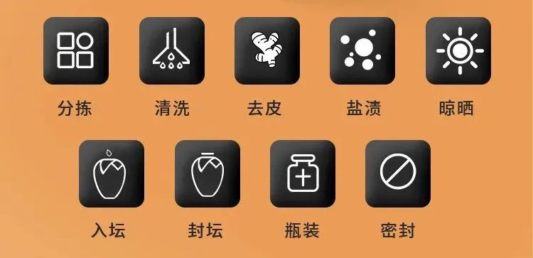 从鲜姜到成品,每一道工序都传统手法,精耕细作,只为每一口难忘:挖姜、洗净刨皮、腌制、晾干、切片、灌汁等9道工序。