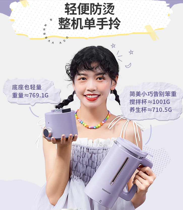 暮光紫、流云白,两个颜色都很好看,有了它早上打豆浆,下午还可以做喝花茶、奶昔、果汁,平时还能在家给宝宝温奶,真的非常实用了!