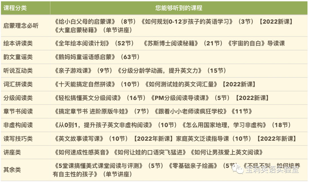 这几年的启蒙经验汇集起来,就是「宝莉英语启蒙学堂」的全部精华,16个专栏系列课+10个单独讲座课(每年都会持续更新)。