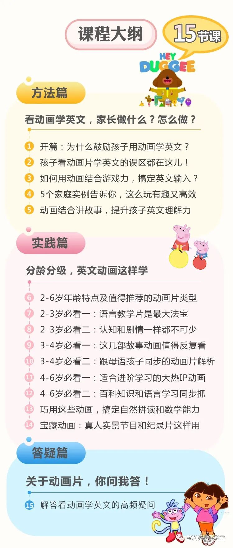动画课则是把2-6岁核心段的推荐动画都列出来,并通过实操案例告诉家长怎么用好英文动画片。