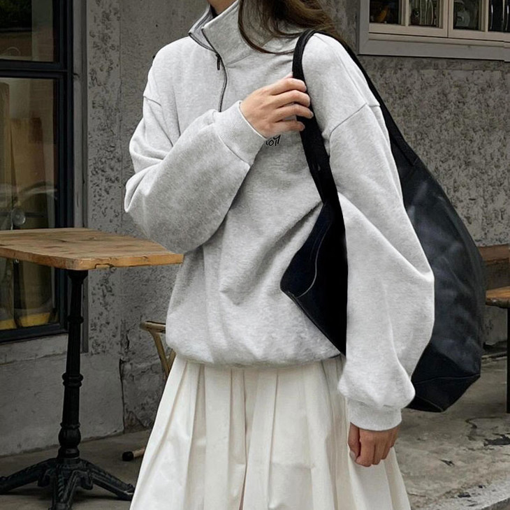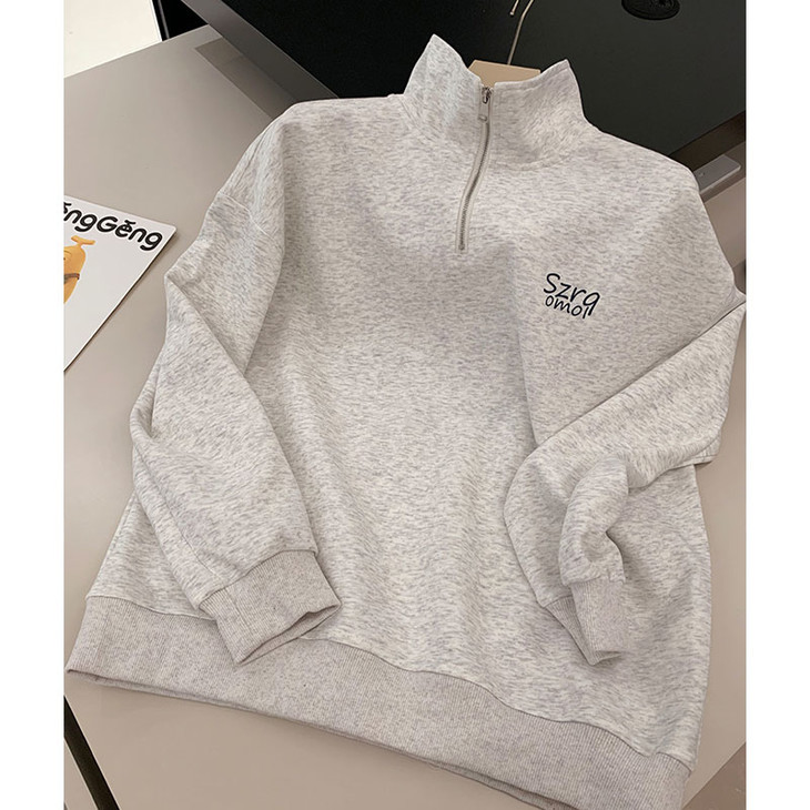 文案:#年货节大促 本期超爱的韩系卫衣✨简约灰色,半拉链设计给整体设计注入灵魂,小宽松版型一点都不挑身材,内搭单穿都好洋气😍