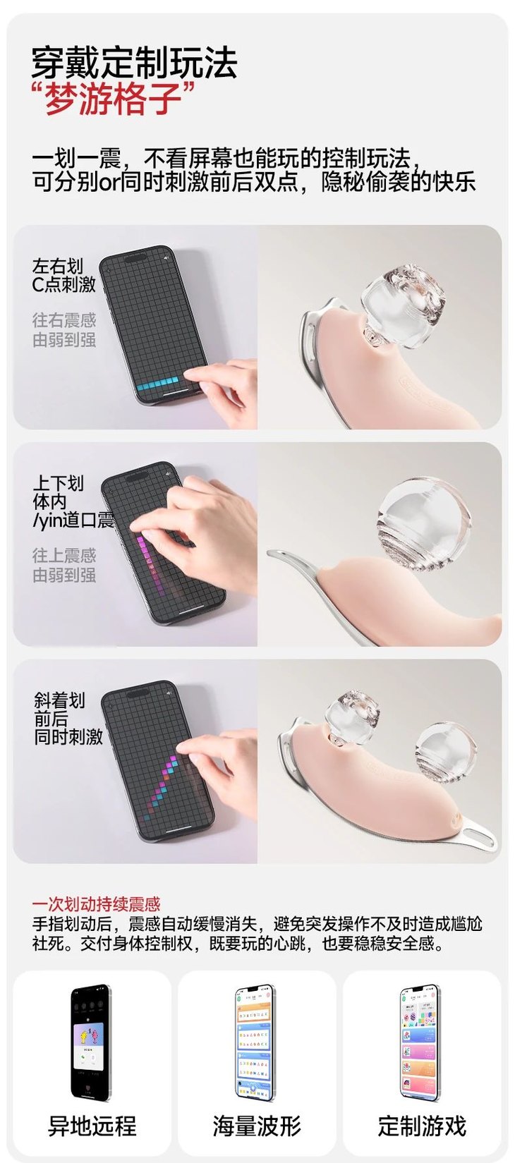 除了可以控制震动吮吸的强度频率这些基本功能之外,它还有很多超好玩的游戏,比如梦游格子,一划一震,不看屏幕也能玩的控制玩法,可分别or同时刺激前后双点。