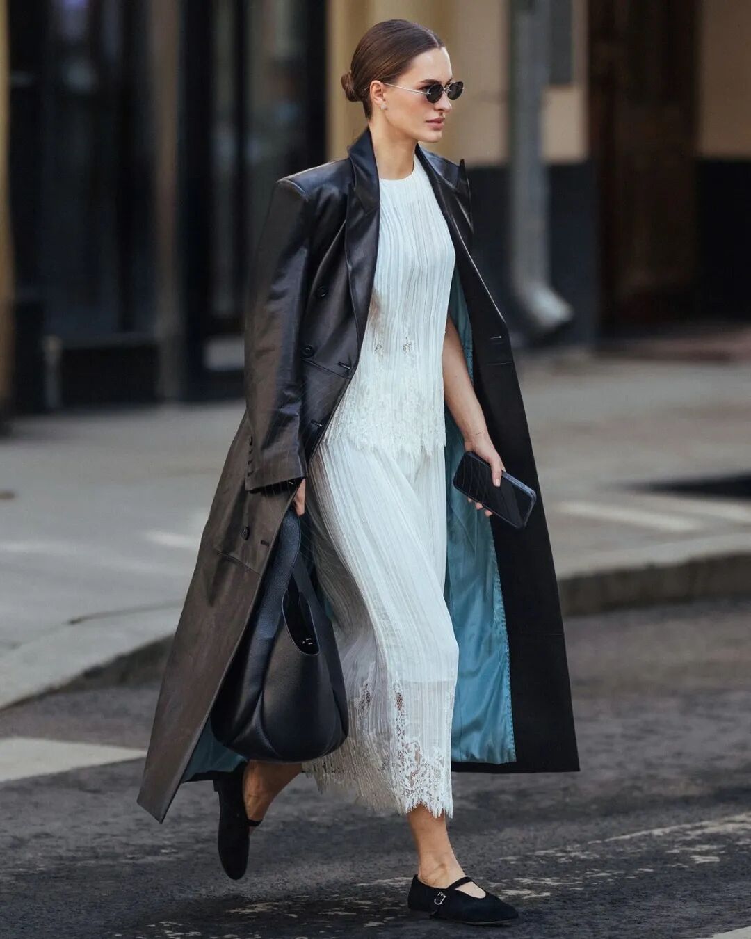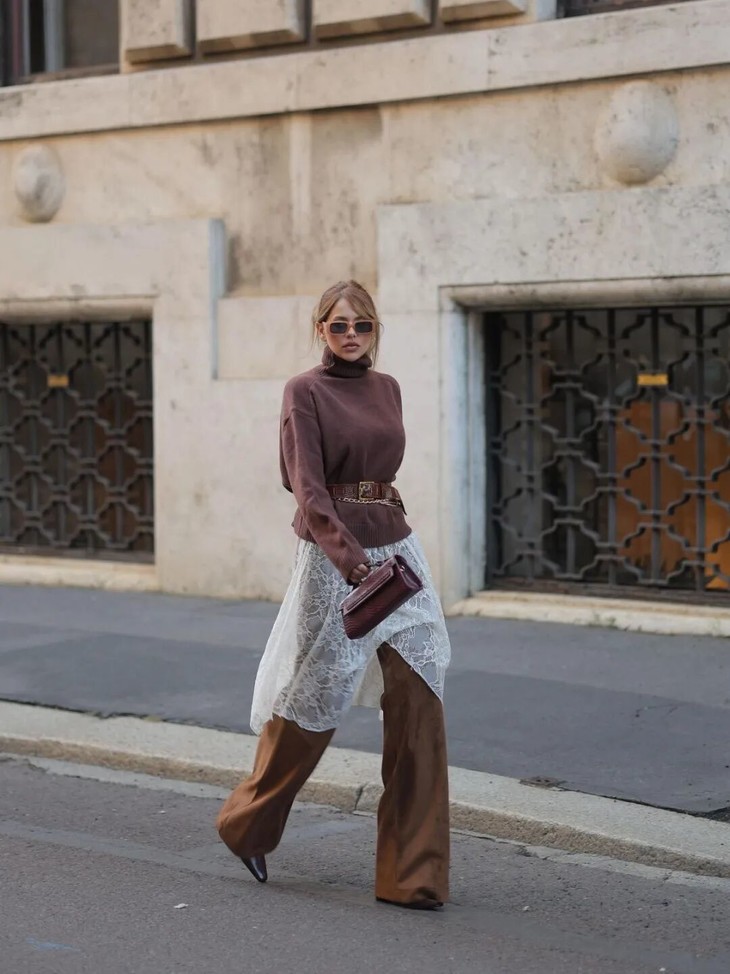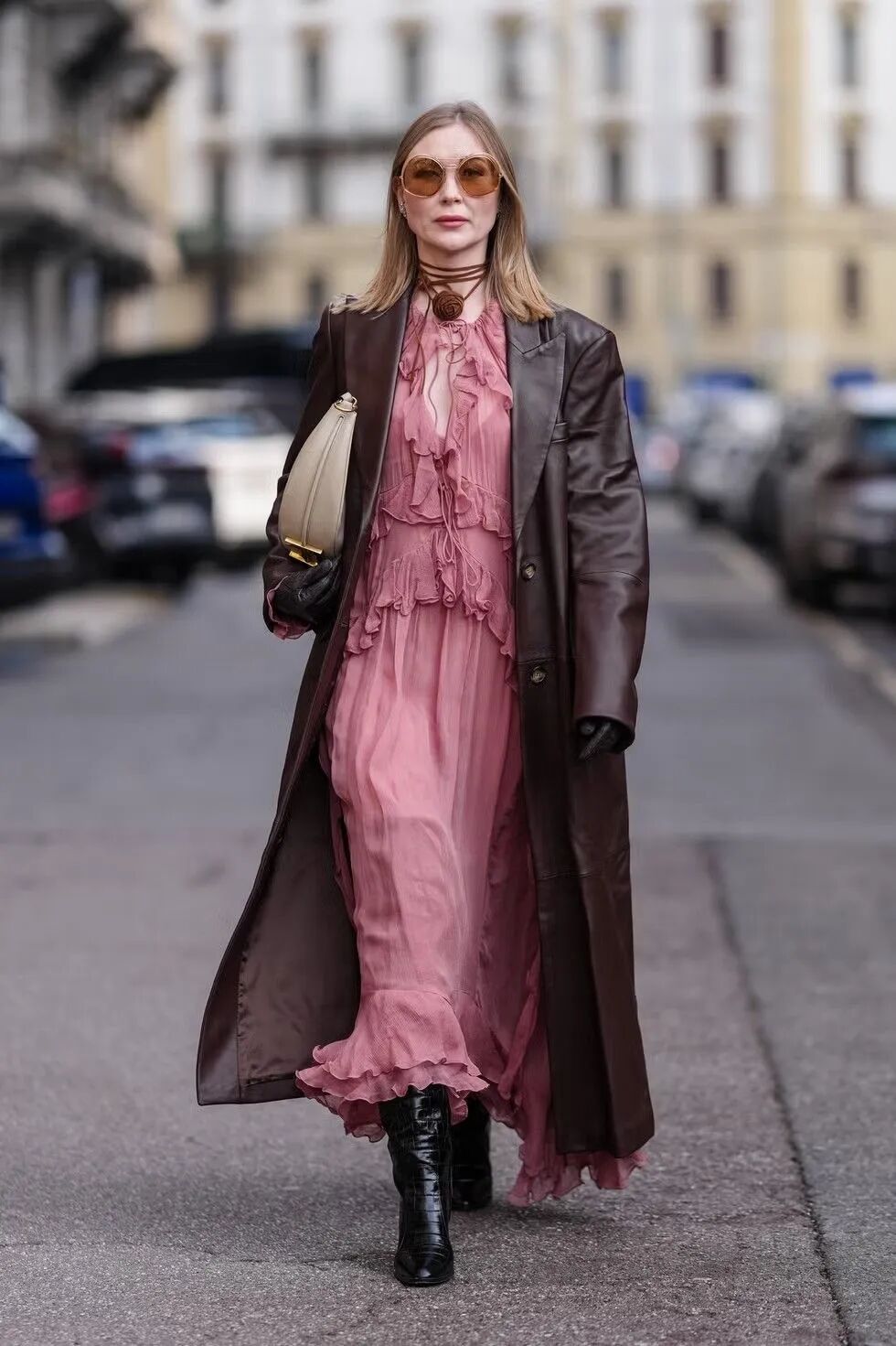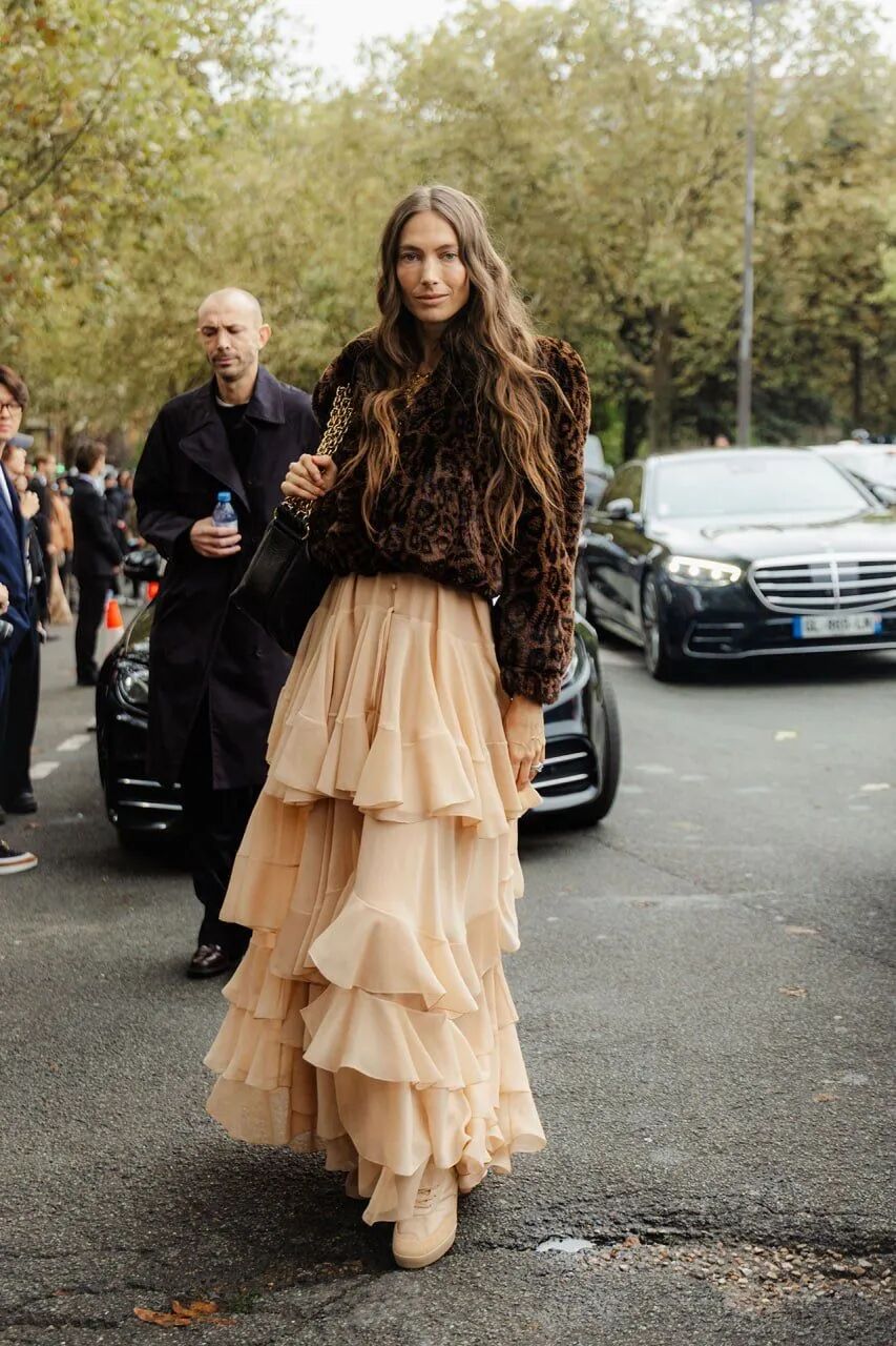 上半身可以是较重的针织毛衣、呢子外套或大衣,下半身换成带有轻盈感的半裙或连衣裙下摆,好比薄纱裙,羽毛裙的通透飘逸会自然削弱厚重感,让步伐在视觉上显得更轻盈。