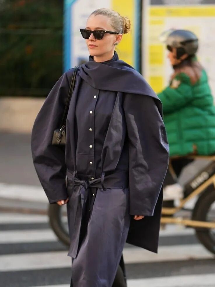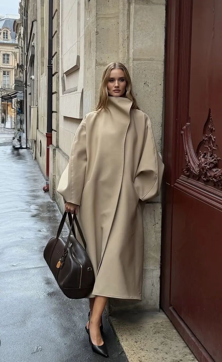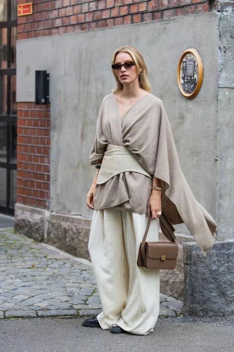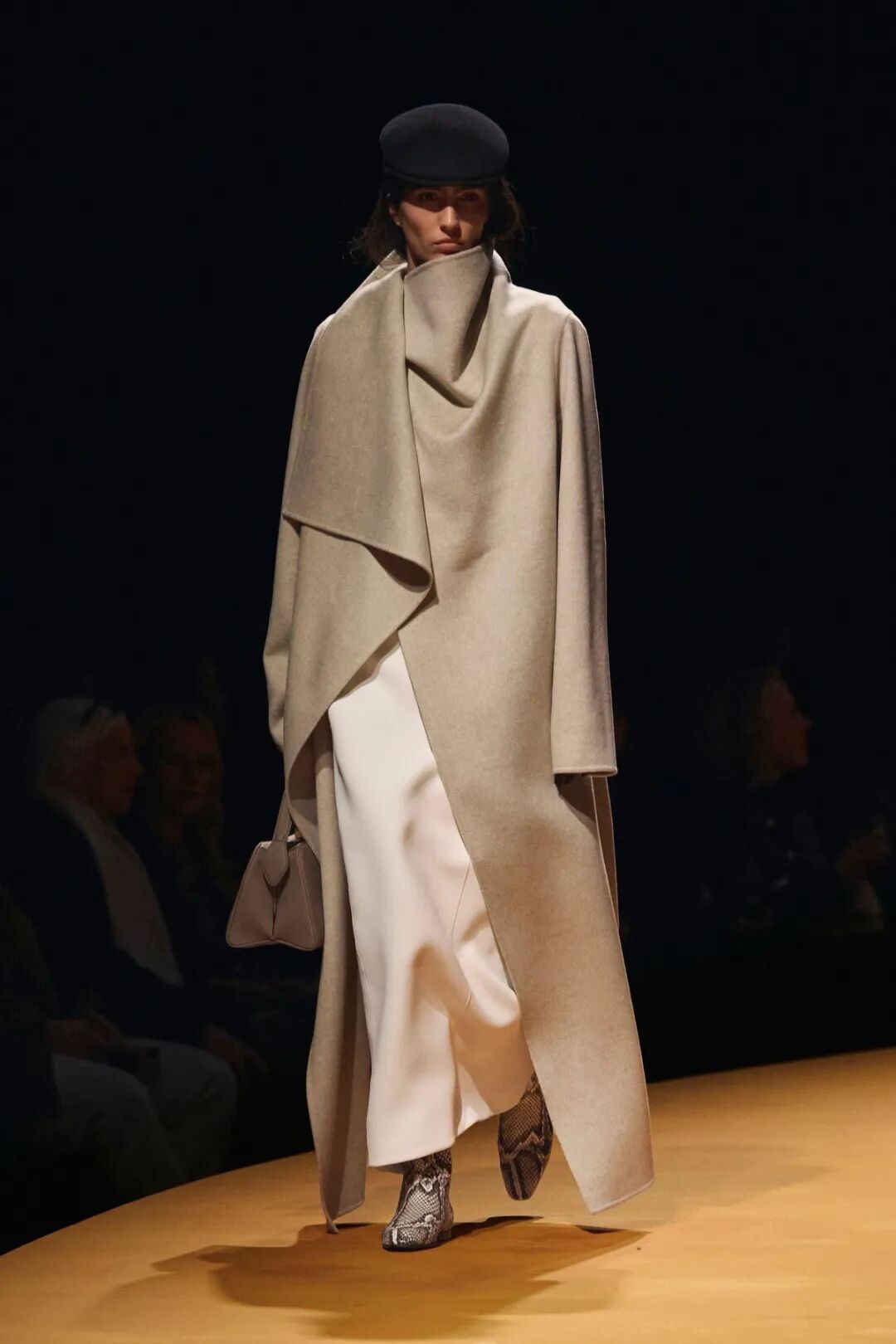围巾大衣和漏斗领大衣,就是很典型的例子。它看起来像大衣和披肩的结合,上半身的线条从肩部自然延伸到领口,再顺势垂落到胸前,没有明确的边界。