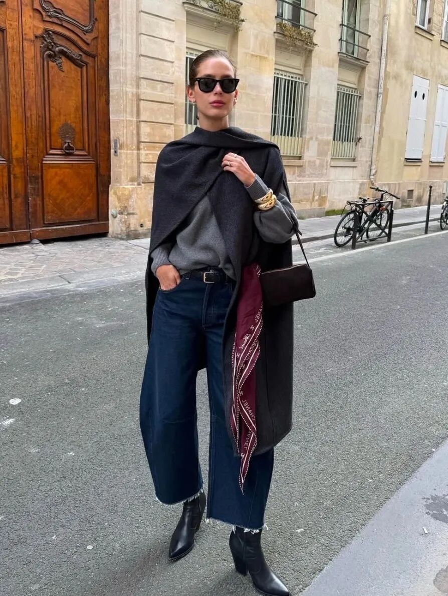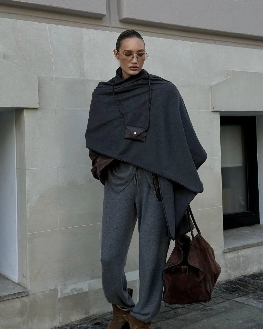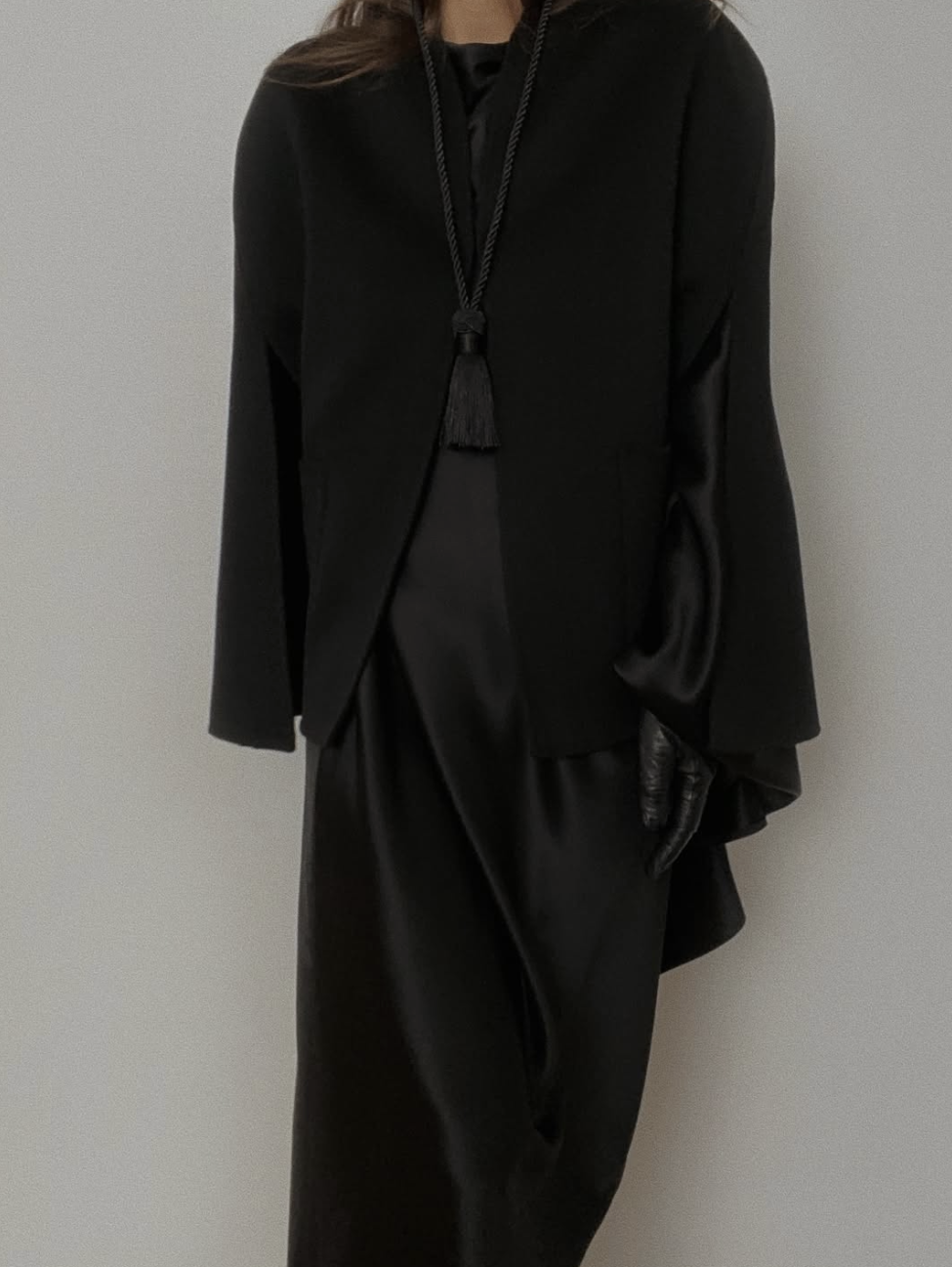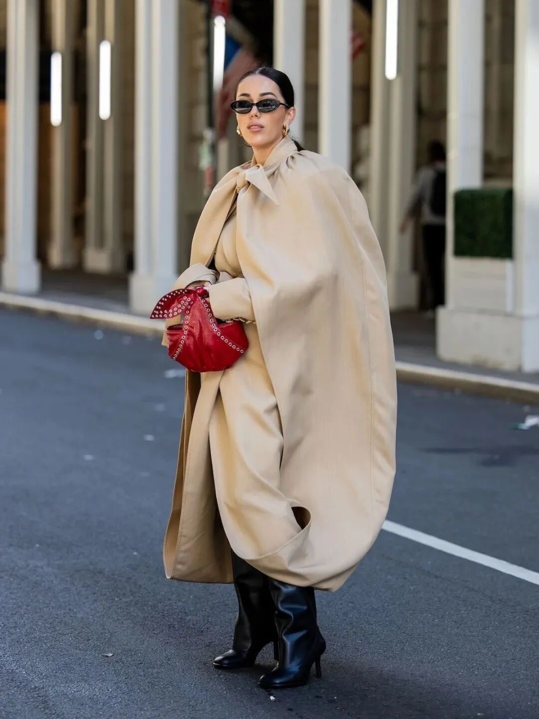 围巾大衣和漏斗领大衣,就是很典型的例子。它看起来像大衣和披肩的结合,上半身的线条从肩部自然延伸到领口,再顺势垂落到胸前,没有明确的边界。