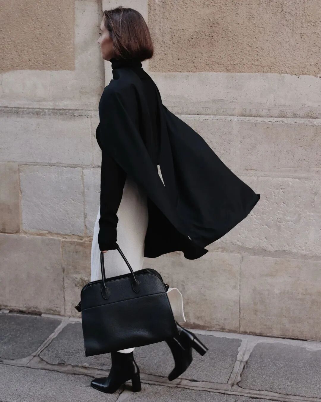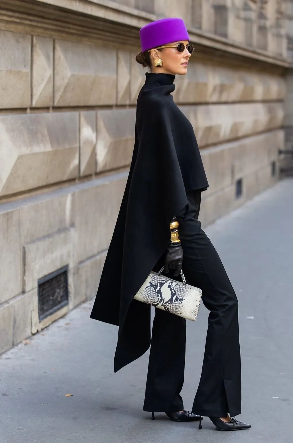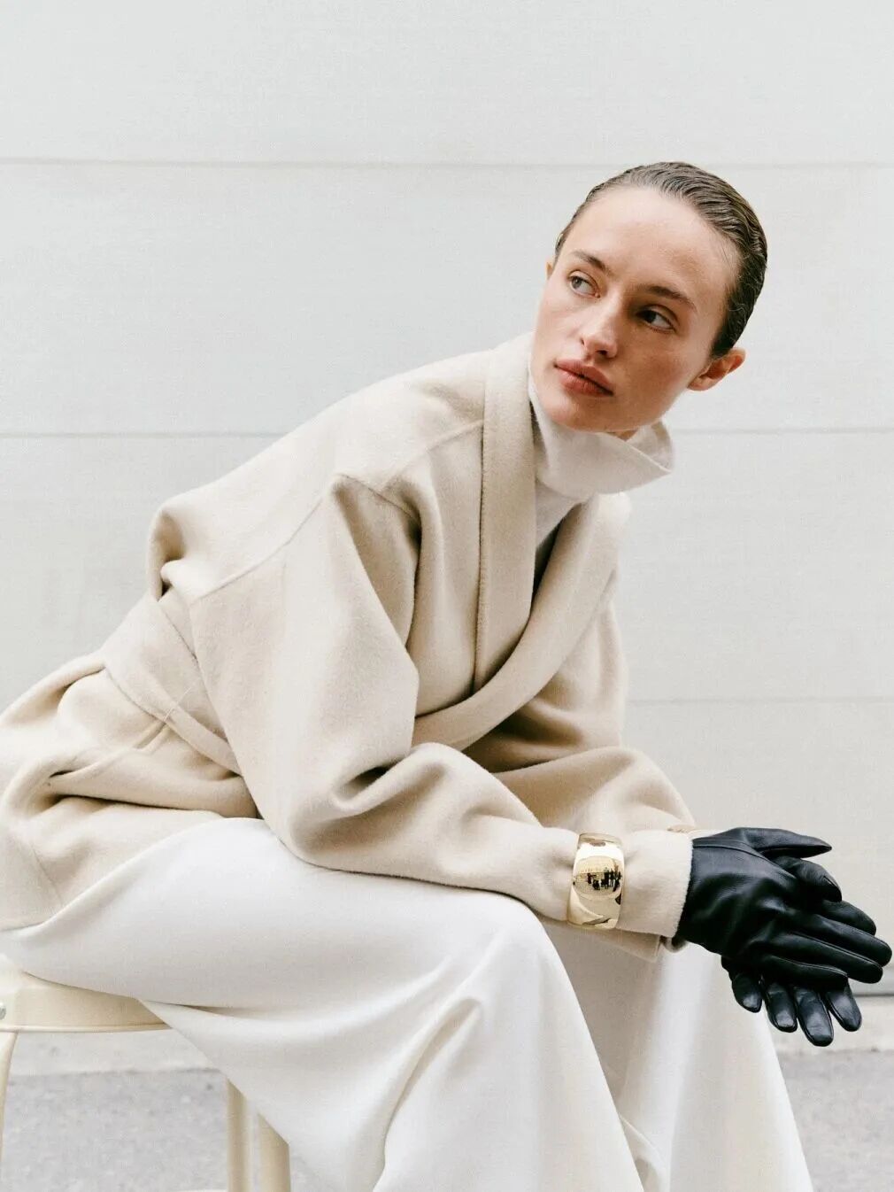 冬日艺术系穿搭的高级感,首先来自裁剪,而裁剪的重点落在肩颈线和衣身的弧度上。