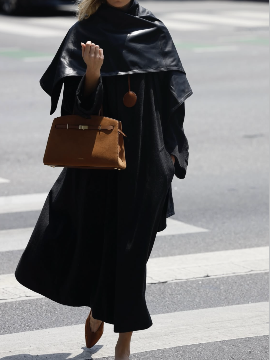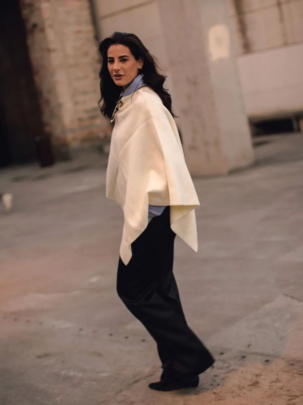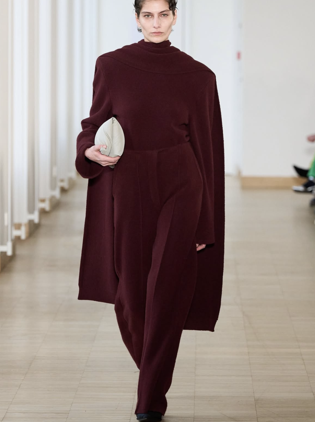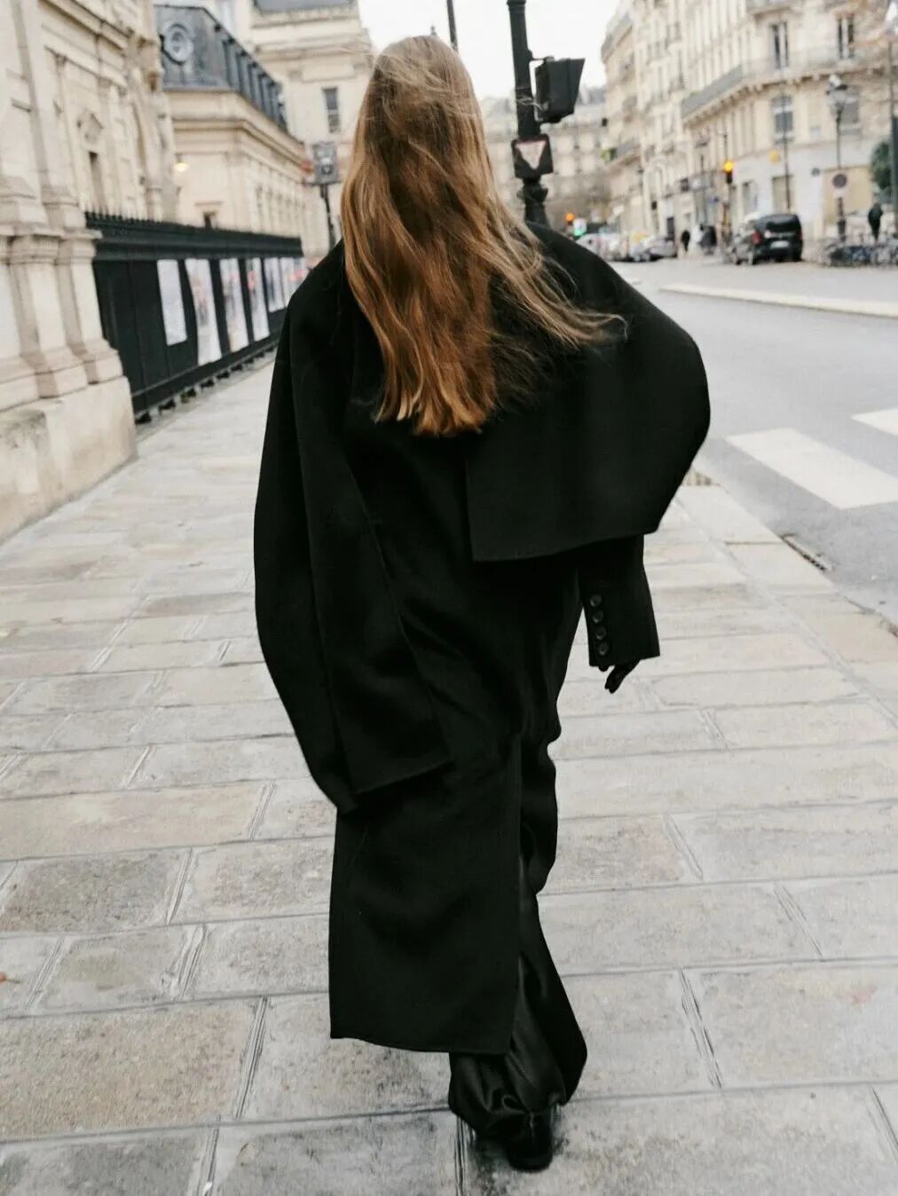 冬日艺术系穿搭的高级感,首先来自裁剪,而裁剪的重点落在肩颈线和衣身的弧度上。