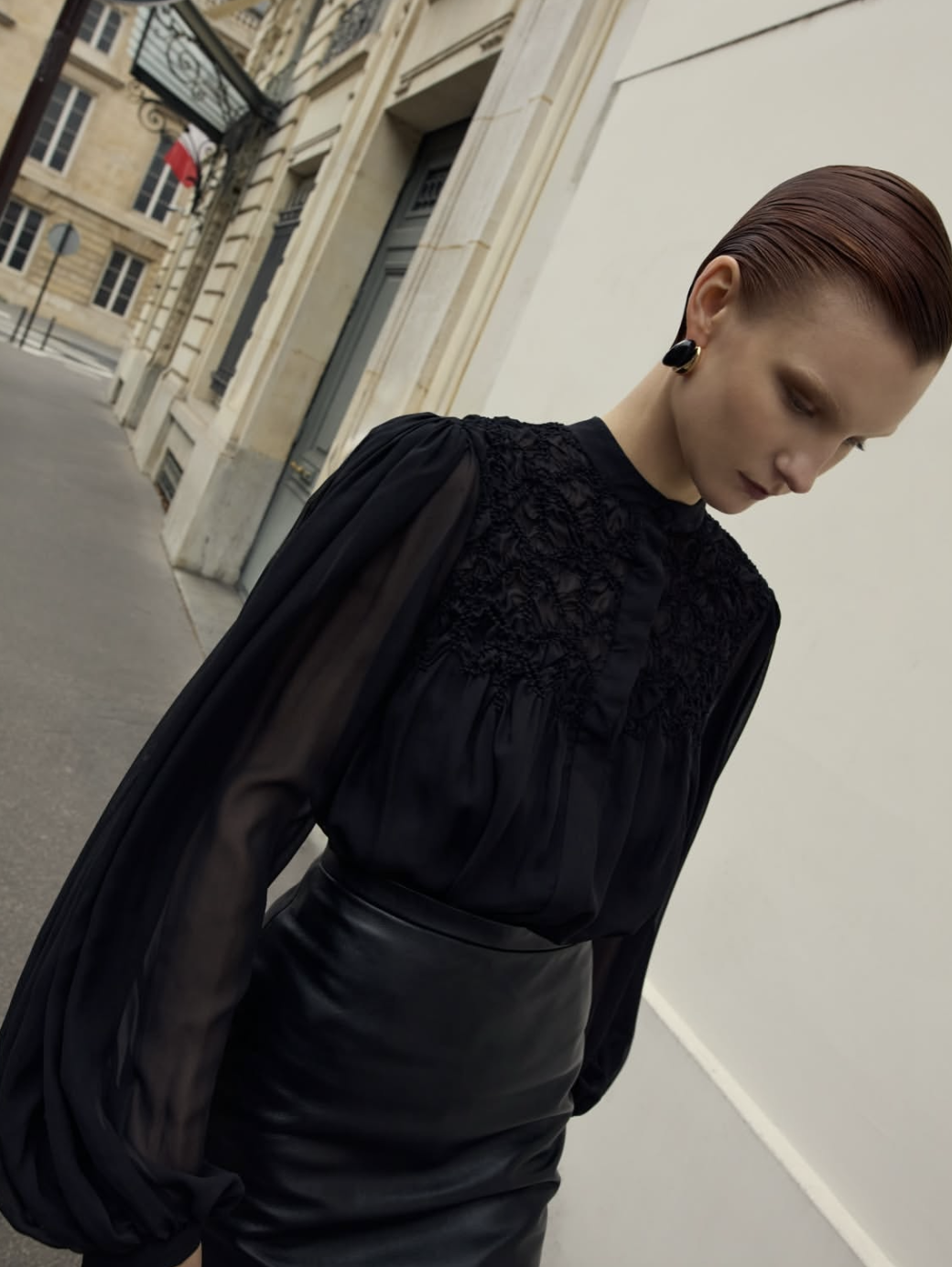 它让领口以向上聚拢的方式出现。脖子的位置由一圈立体的弧线围出,视觉重心自然上移,脸部轮廓被衬托得更清晰。