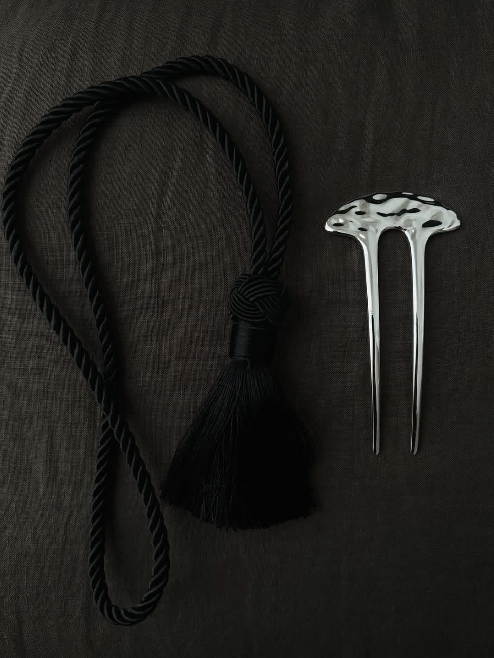 首饰的形态更接近雕塑。比如大体积但线条圆润的金属耳环,宽而略微扭转的手镯,形状不完全对称的珍珠项链。