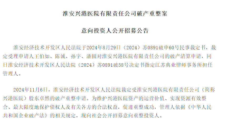 淮安兴港医院有限责任公司发布公告,将进入破产重整流程,公开招募意向重整投资人。