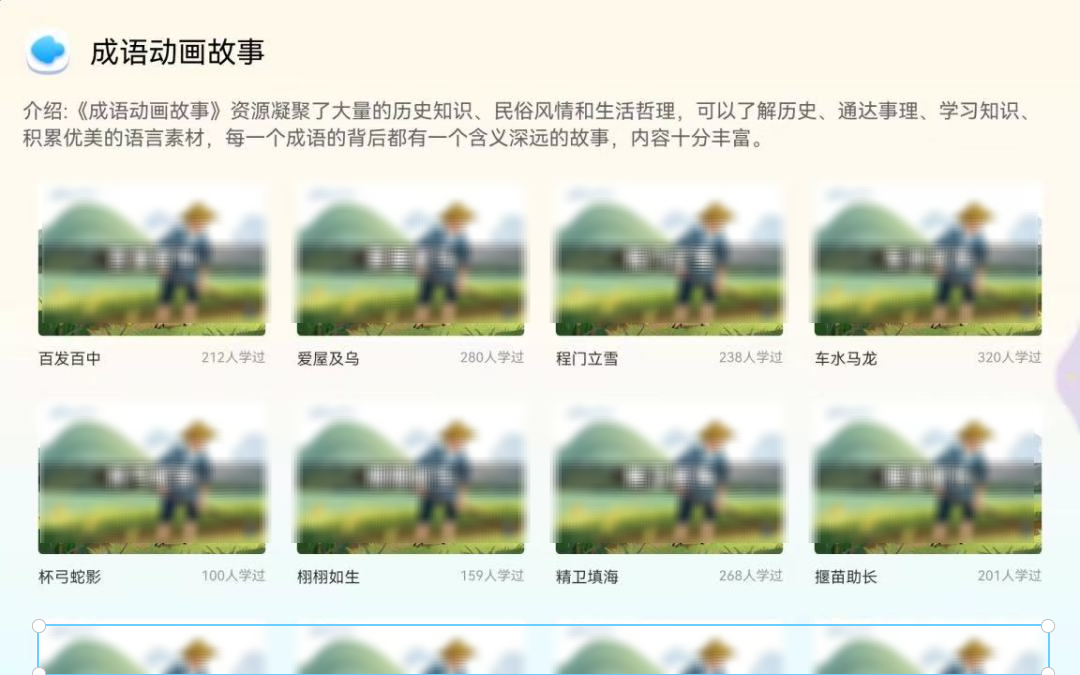 学好生字后就可以开始进一步的字词成语的学习和积累了,【成语闯关】和【成语动画】都可以帮助孩子在游戏和动画课程中提高成语的储存量。