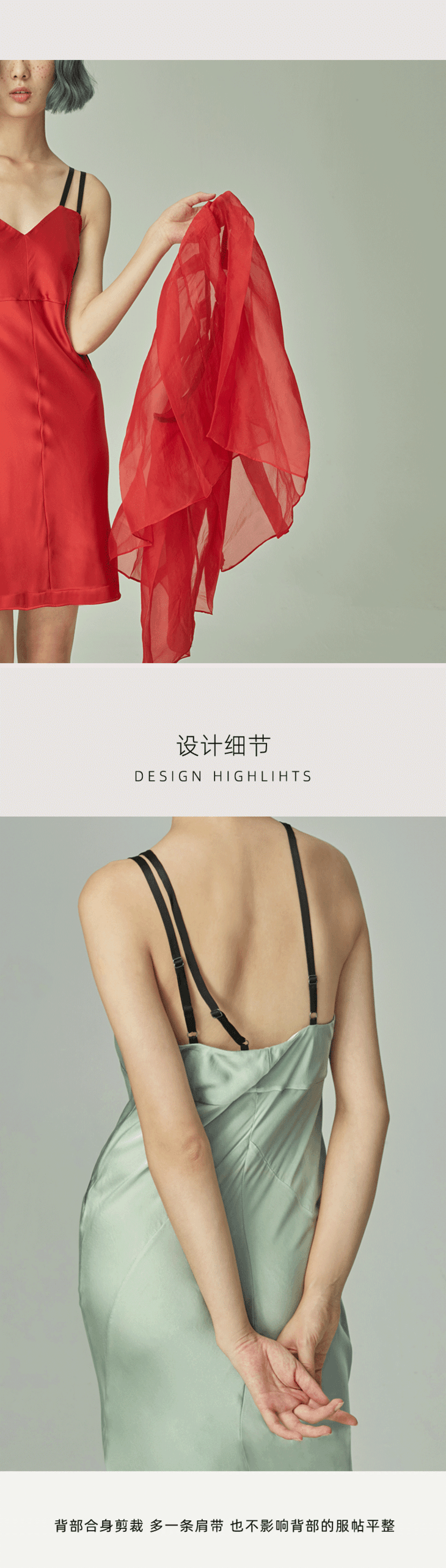 这款23姆米桑蚕丝连衣裙,鱼尾裙摆可随时切换,肩带与裙身撞色拼接,不规则双肩带,拒绝单一,无惧束缚。