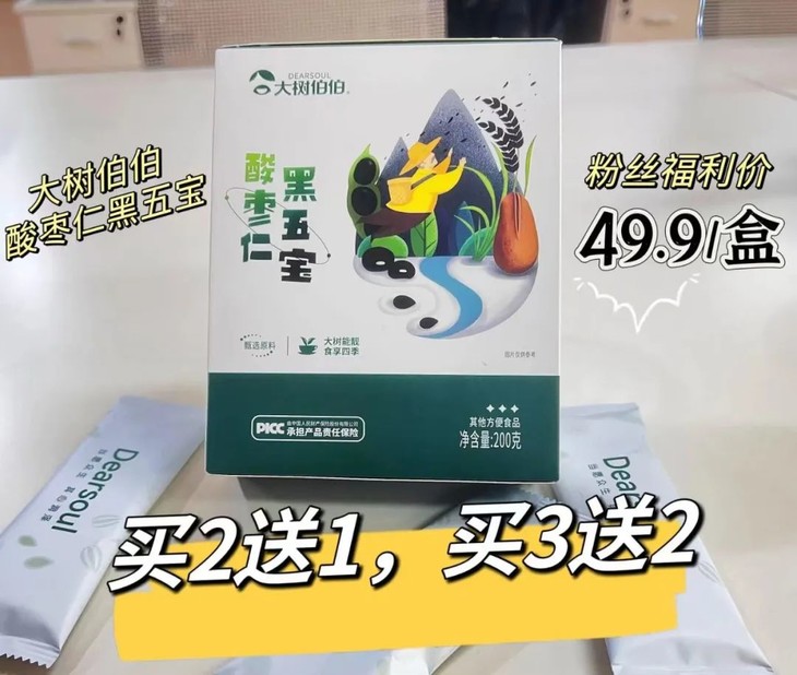 咱们这款好吃又好喝的大树伯伯酸枣仁黑五宝,粉丝福利价99.8元买2送1,149.7元买3送2