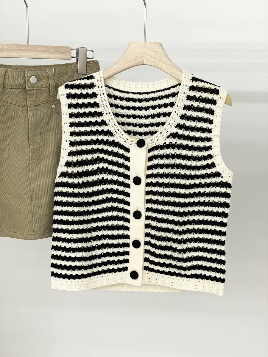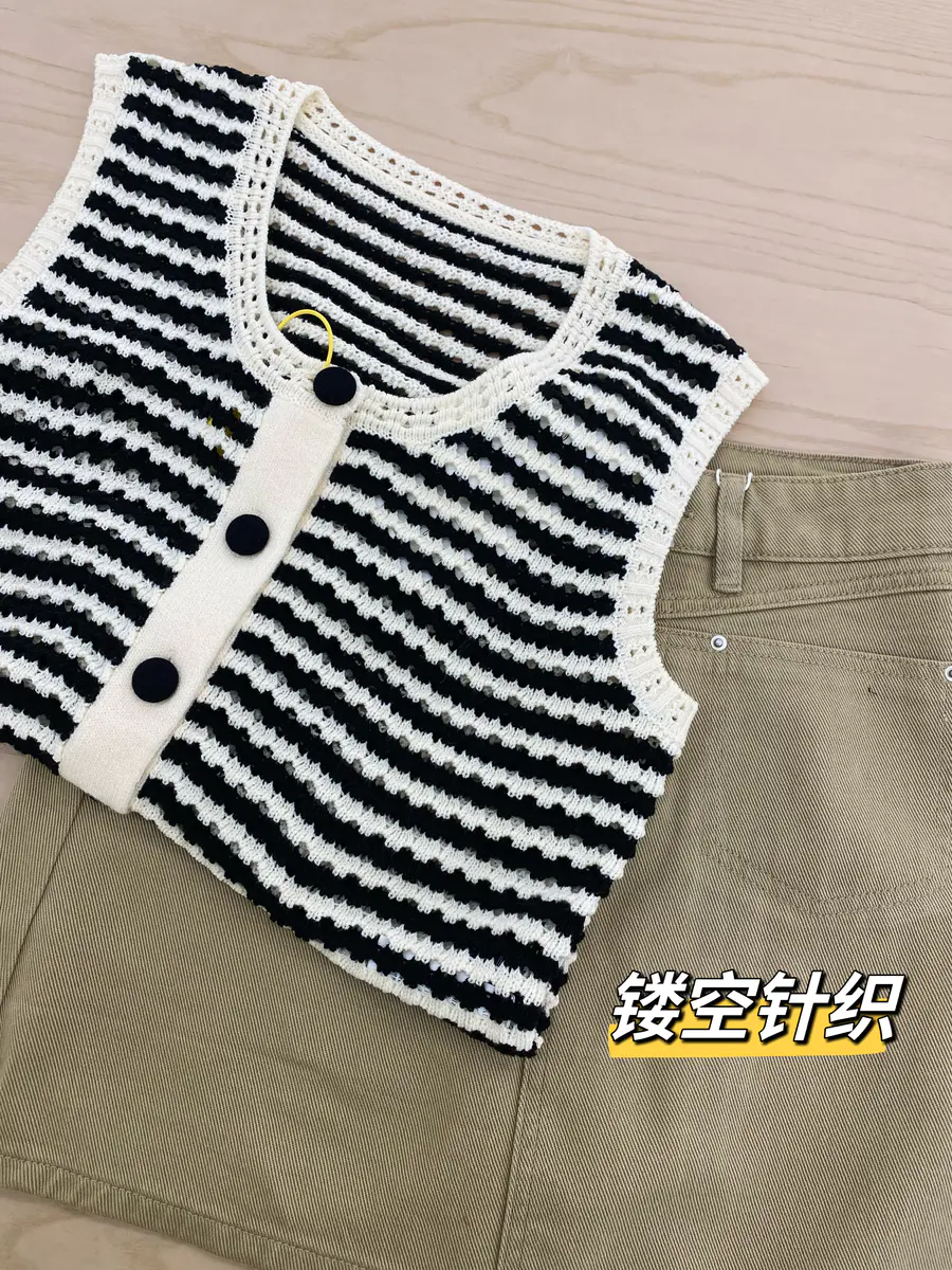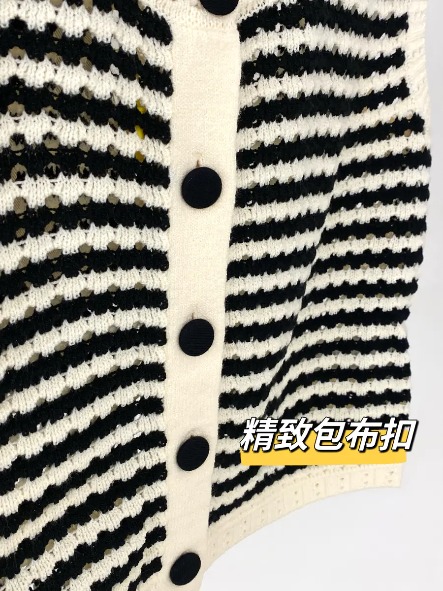 黑白条纹一直都是服装里的经典图案,这款黑白条纹的针织马甲,采用镂空针织的织法,结合领扣别致镂空花纹,整体精致感十足;