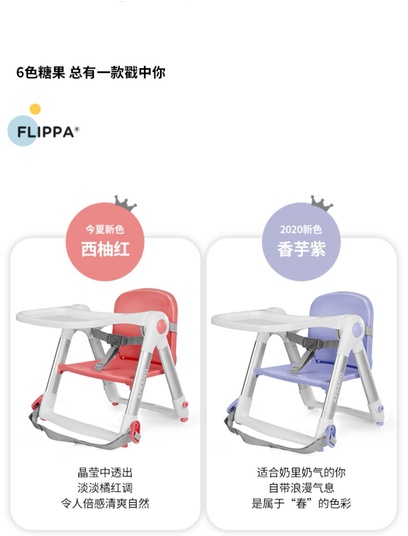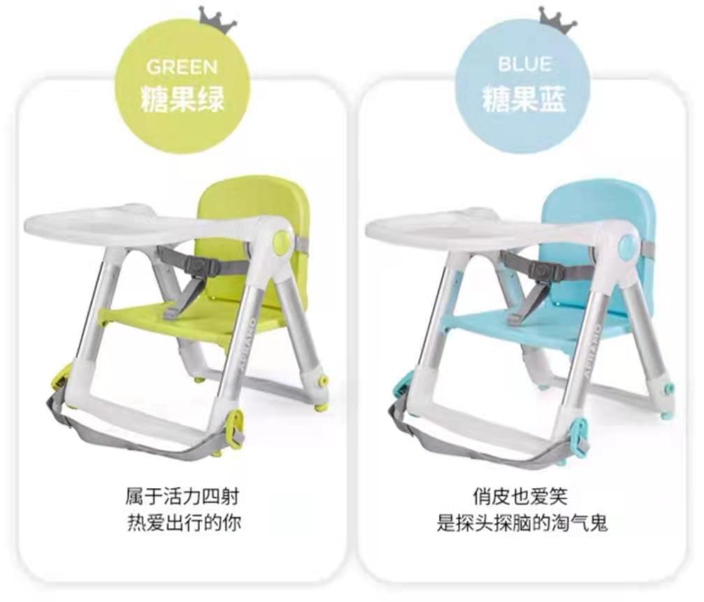炫彩缤纷的糖果色座椅+白色餐盘+金属支架,简约时尚,光泽亮丽,高大上中透露着萌萌可爱风,款式非常漂亮,在外使用的时候绝对吸引眼球,更能突显妈妈面对“战场”的从容不和优雅淡定。