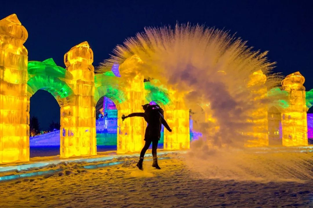 再加上冰上烟花、雪地篝火的狂欢氛围,这里就是冰的艺术海洋和雪的梦幻世界。