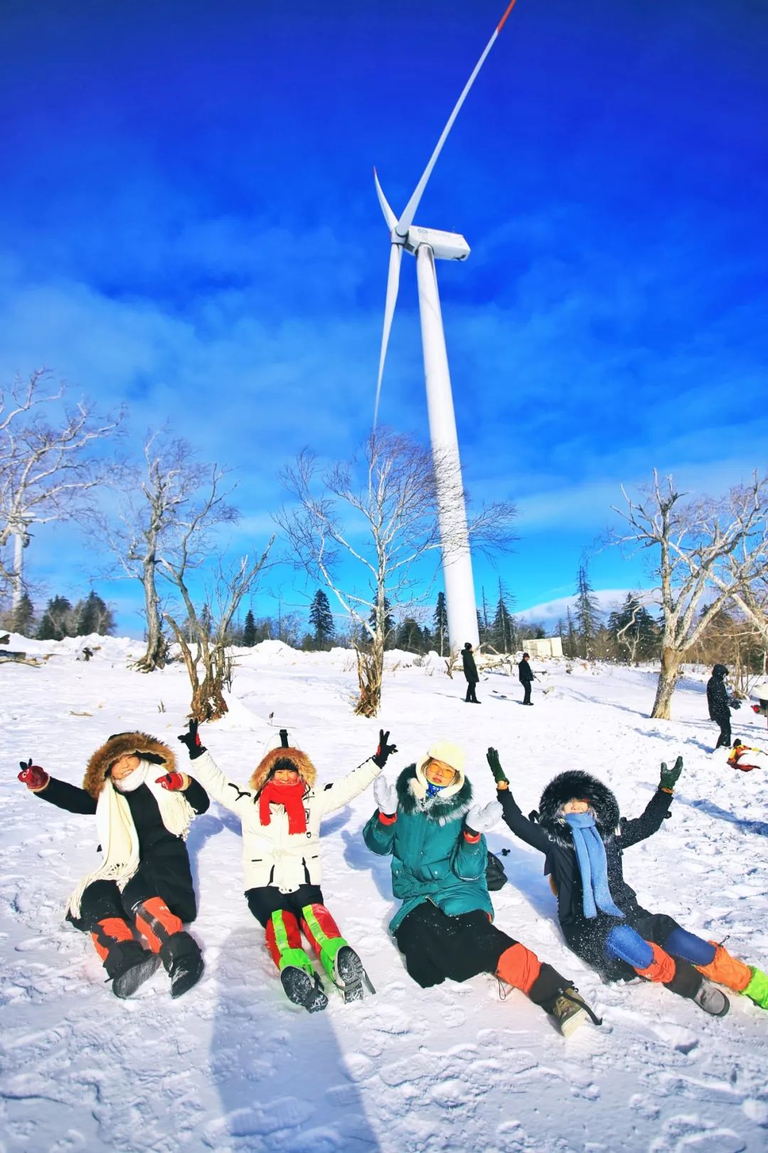 一路踩着厚厚的白雪,穿过原始森林,途径冰封的溪流,直到看见唯美的白色风车与蓝天相接,风车雪山就到了。