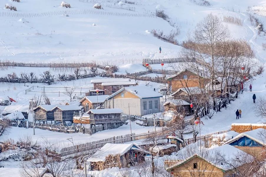 皑皑白雪随着起伏的山峦延绵不断,被积雪覆盖的木房子错落有致地散落在山坡上,挂着霜雪的森林,把它点缀成一幅水墨丹青。