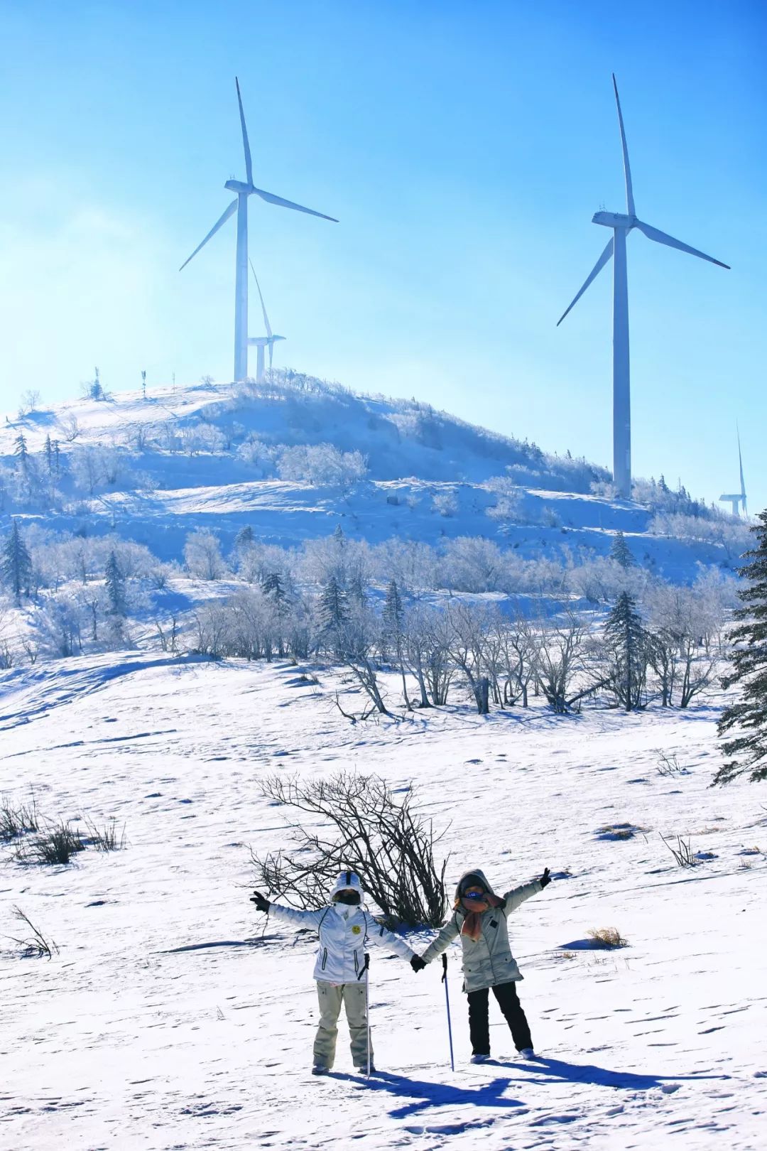 整座山雪厚三尺,亮晶晶的冰霜挂在原始林木之上,蓝天白云下的白色风车缓缓而动,整个世界只有干净的蓝和白,仿佛跌入了纯粹的童话之境。