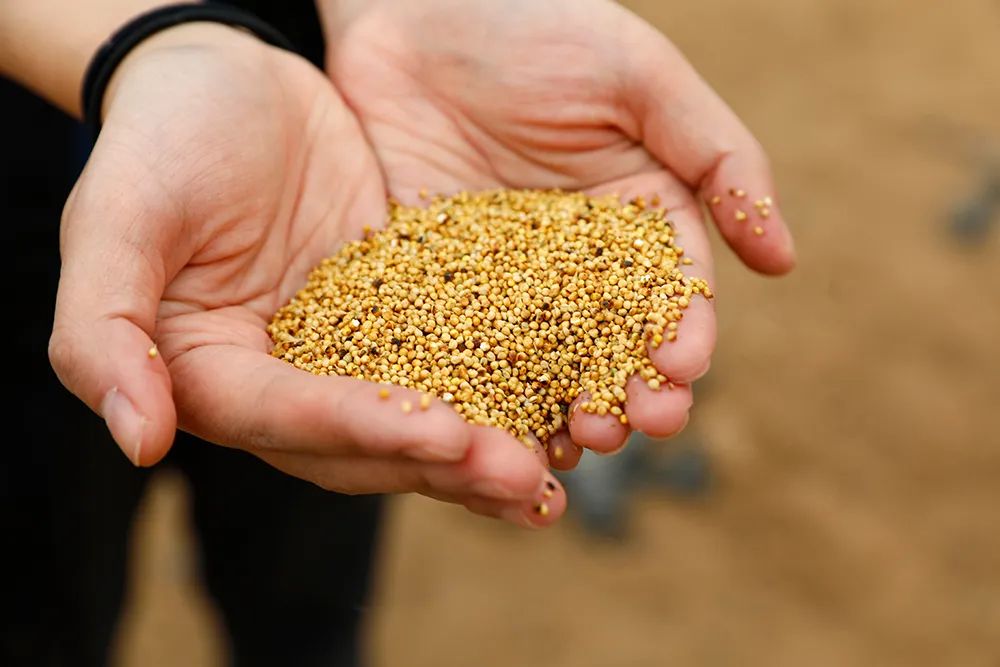 走过戈壁,我们将在任小米种植地里集结。抛下脑中的繁复思绪,大家一起撸起袖子、身体力行。先分队拔河热身,随后向播种机投放种子,见证春播的启动。同时,古法播种分组比赛也将开始,想在播种、铺设滴灌带的比赛中胜出,是需要一点实力的。