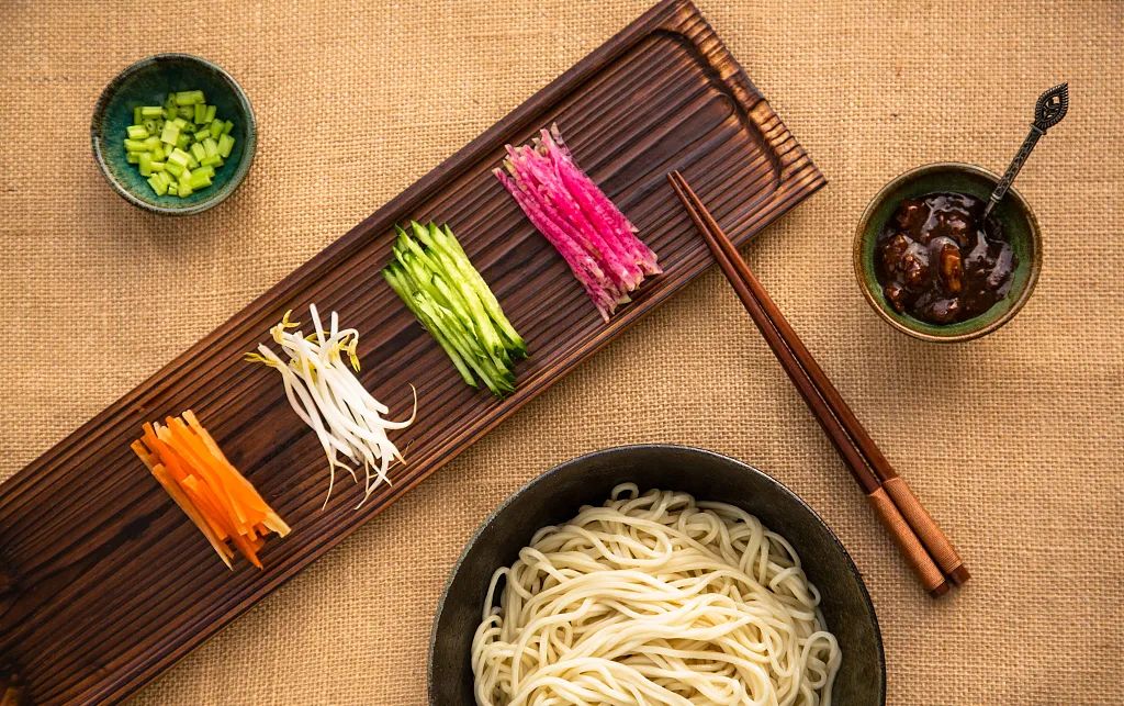 配上脆生生的黄瓜条,红滟滟水萝卜丝,橘黄色的细萝卜丝,加上一勺浓郁的番茄肉酱。然后就可以直接开吃了,夹一筷子面,蘸着蘸料;再夹一筷子配菜,搅拌均匀……不同于老北京炸酱面,意面配上浓郁的酱料和菜丝,咀嚼滋味无穷变化多端。吃完一碗面之后,元气满满。