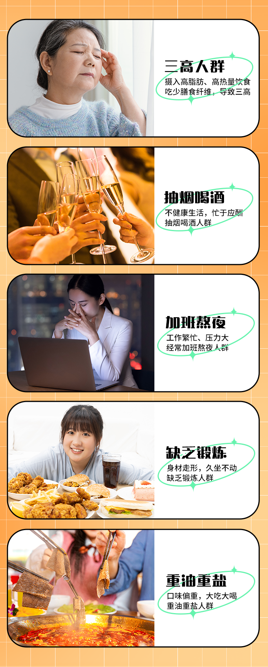 三高人群、加班熬夜、烟酒频繁、高盐高钠油腻饮食、缺乏运动人群