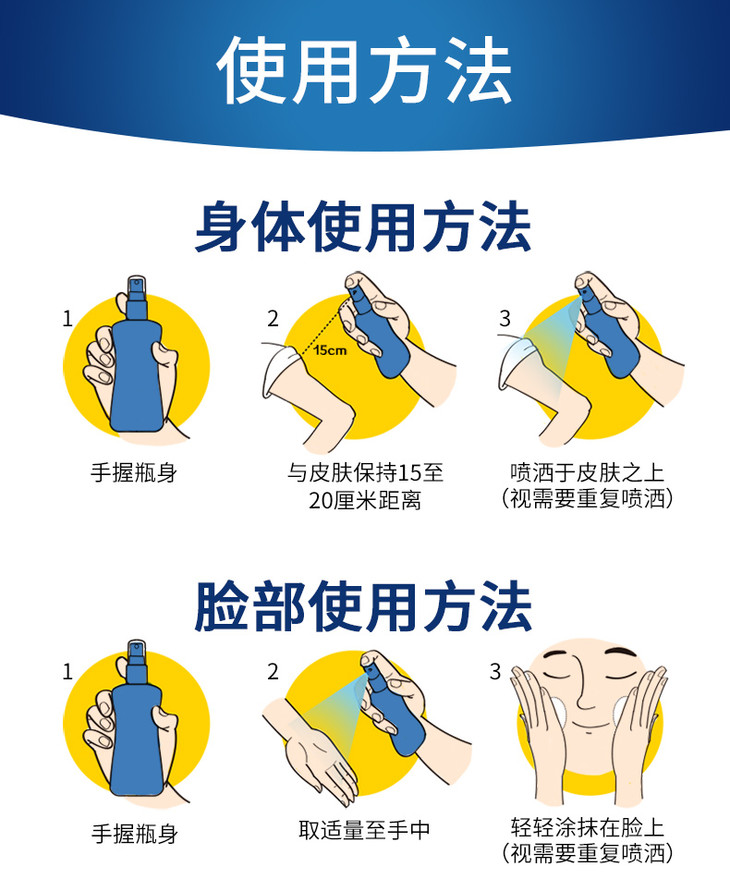 使用前请搖匀,在离开暴露的皮肤15-20CM处,正面的喷洒,也可以使用在脸部和手上,但是注意避开眼睛和嘴巴。
