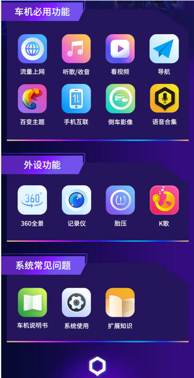 我们看到上面有流量上网、听歌/收音、看视频、导航、百变主题、手机互联等等的分类。