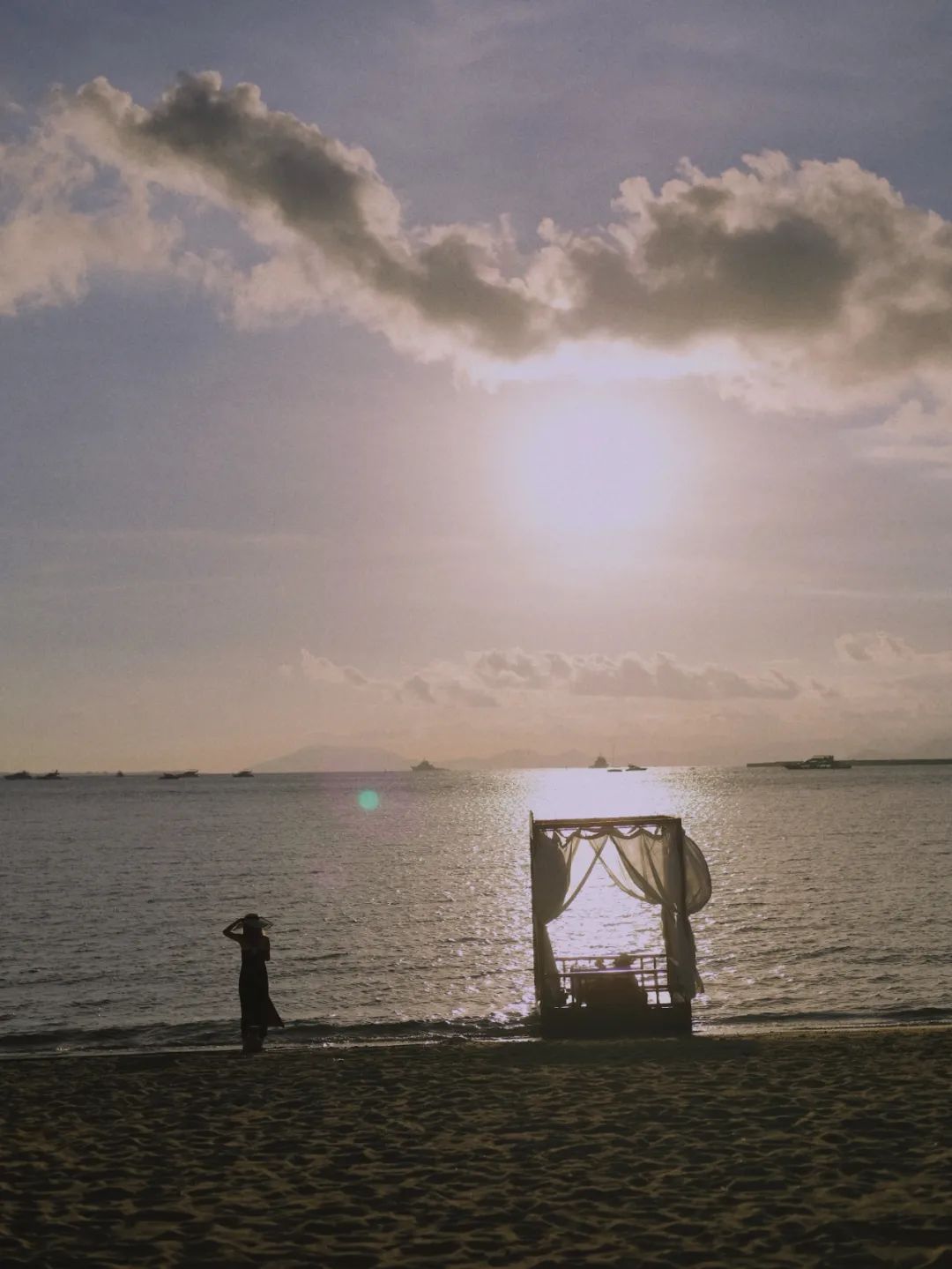 住在鹿回头湾有个好处,可以在沙滩上欣赏最美夕阳!这里还树有硕大的悦榕庄logo,是酒店内的必拍打卡点哦~