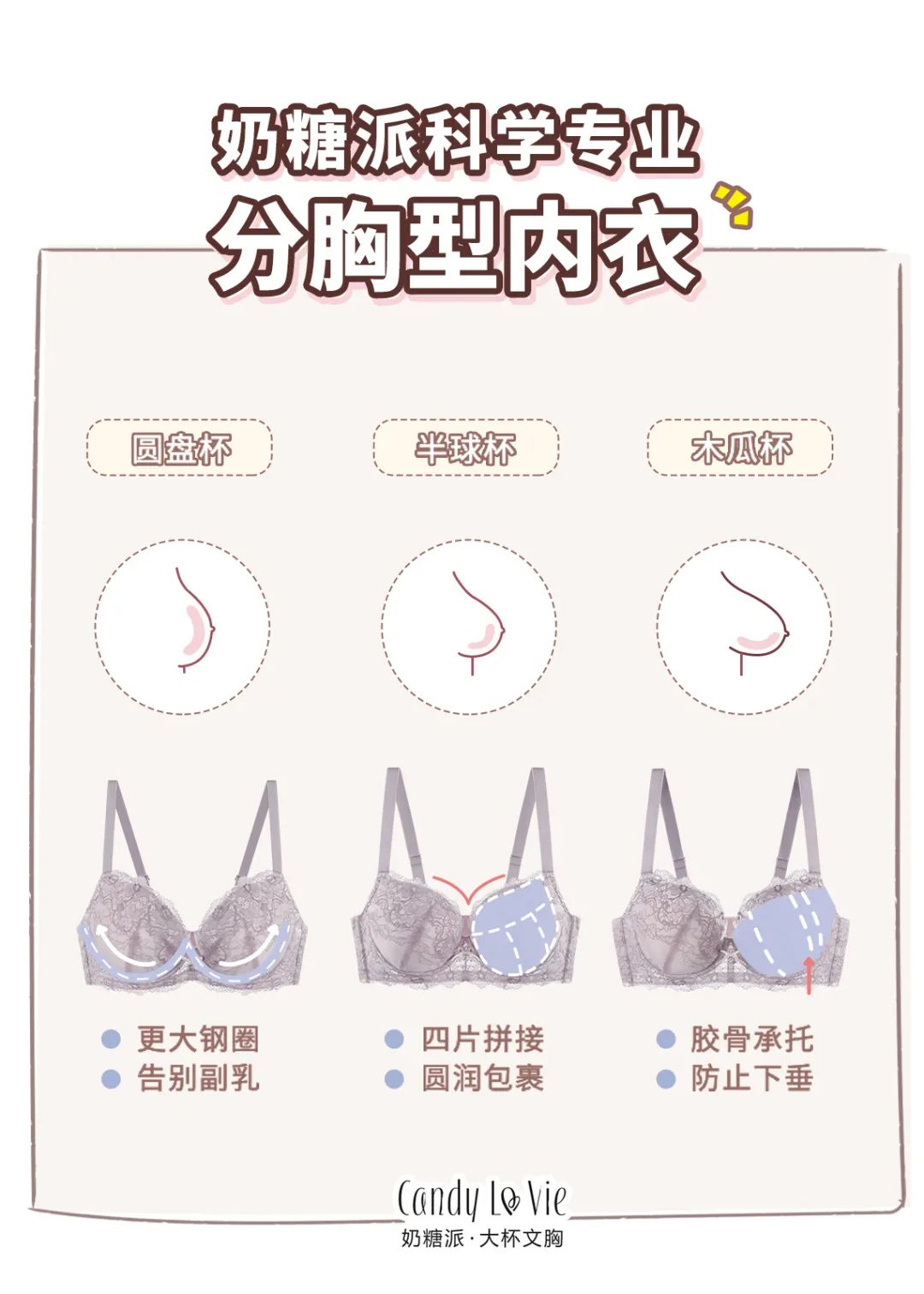 一件看似外貌相同的内衣,做出三个适合不同胸型的杯型,这就是奶糖派专为大胸女生设计的分胸型内衣。