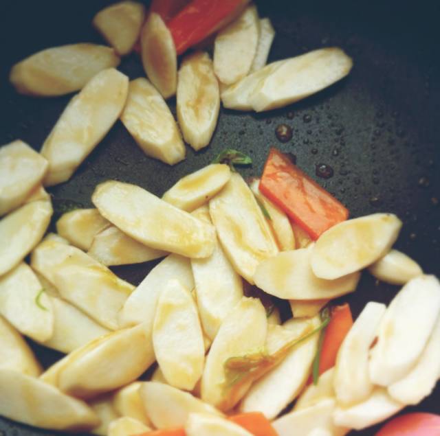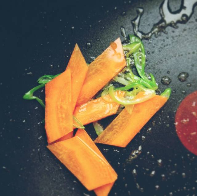 1、热锅凉油,葱姜爆香,胡萝卜片入锅翻炒红润;