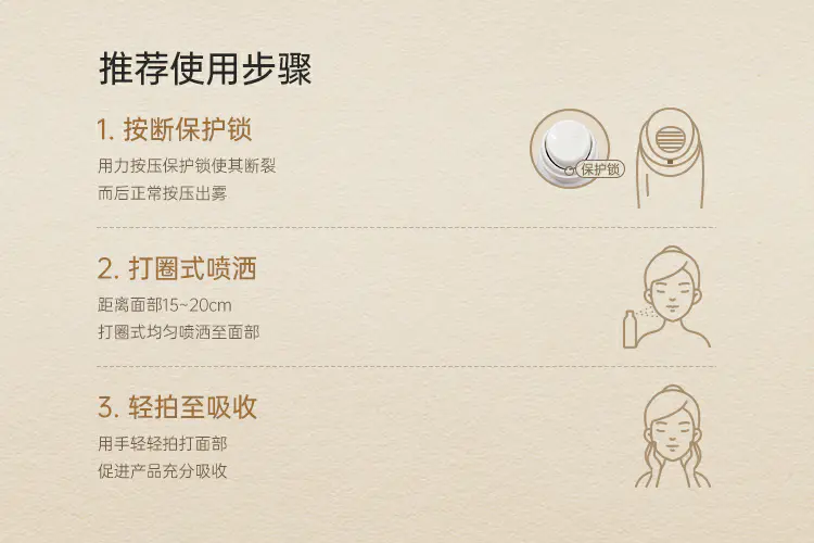 a.距离皮肤20厘米左右环形运动按压喷头每次喷洒2圈
