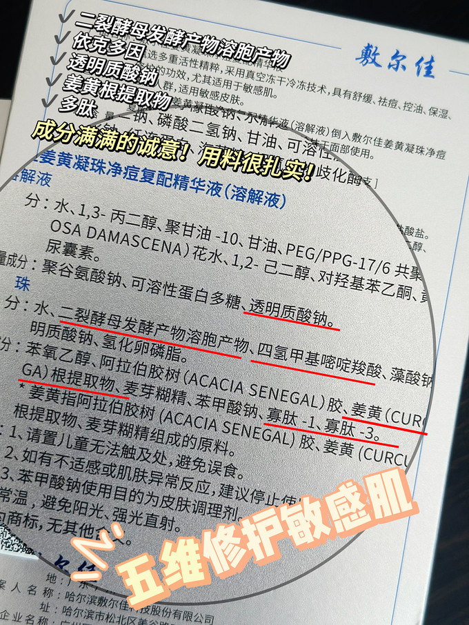 产品含有二裂酵母发酵产物、依克多因、姜黄根提取物和寡肽-1、寡肽-3等有效成分。强大的舒缓修护和保湿力,可以更好的恢复脆弱肌肤屏障,油敏痘肌战“痘”不盲目!