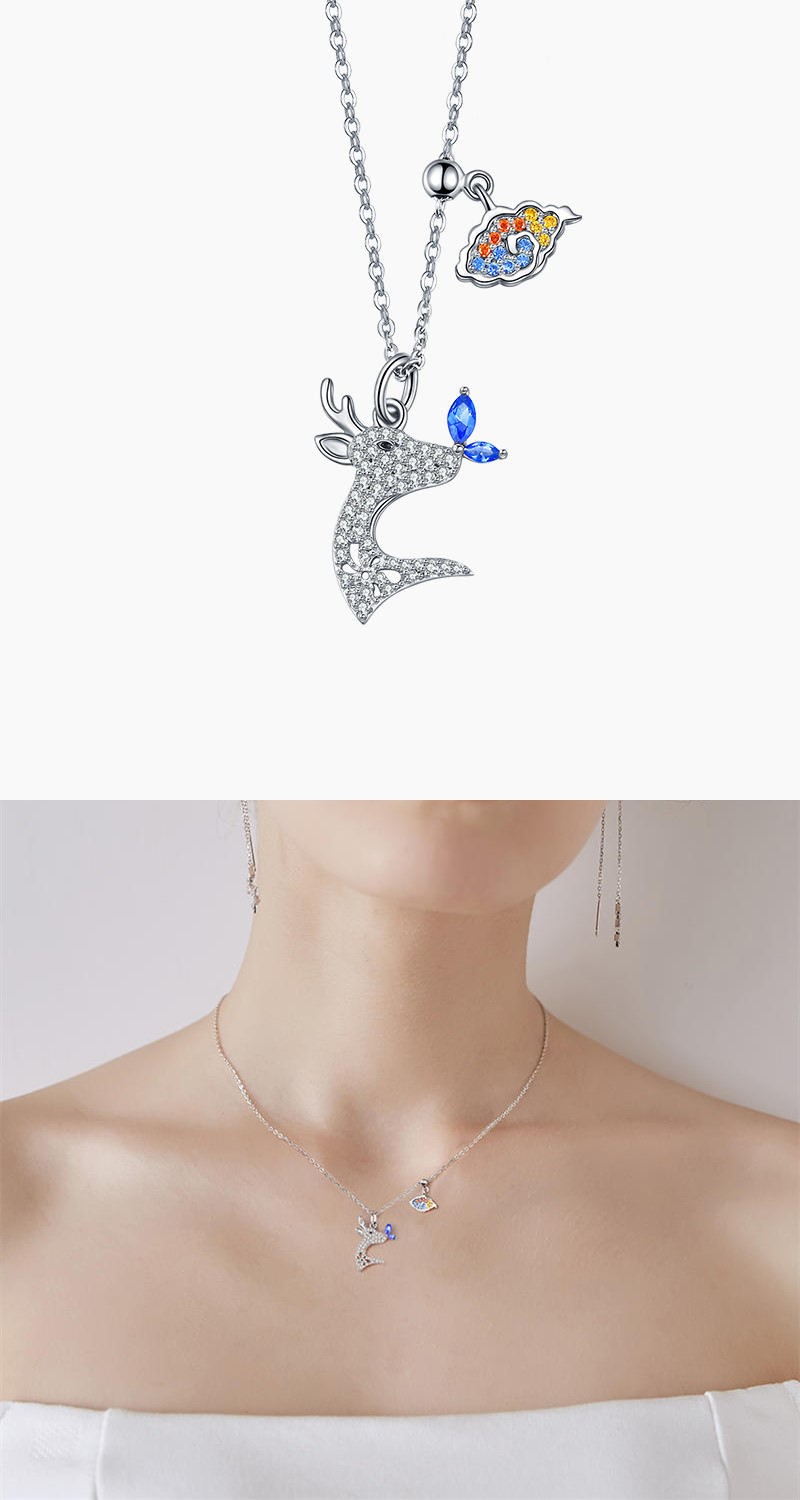这款鹿影仙踪系列灵鹿戏叠项链,仿佛叫人拨开了幽幽密林,迷失于那云雾朦胧的仙境,如同精灵般的小鹿,追逐着灵动轻盈的蝴蝶,而蝴蝶轻轻飞来,在它的鼻尖上留下一个美好的吻!一切美好都绽放在此刻,你是否也有这样一只蝴蝶,在你心里留下一吻呢?
