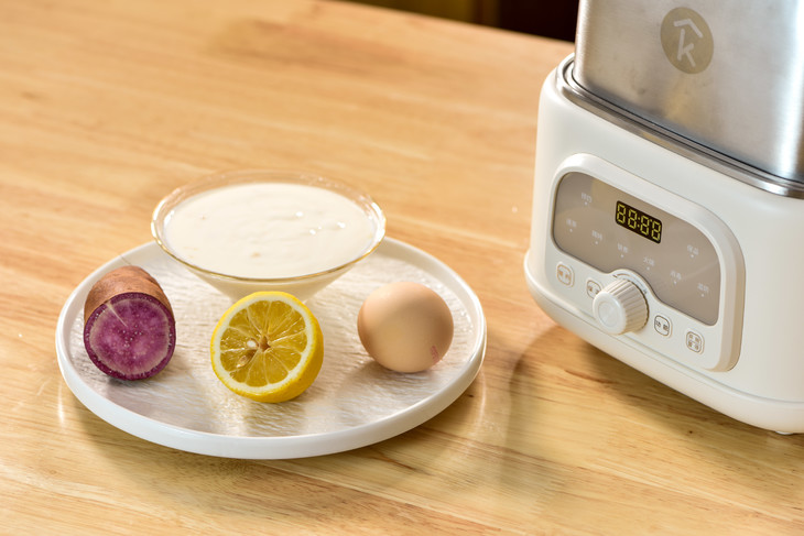 4、将打散的鸡蛋、紫薯泥、柠檬汁放入同一个碗中,加入酸奶一起搅拌均匀。