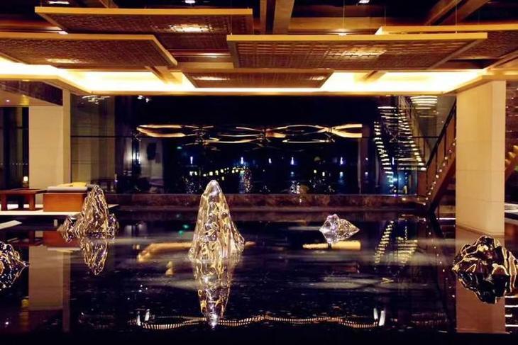 在大堂门口水景下方的1层,别出心裁凿出的顶部天井下,是一艘流光溢彩的江南“乌篷船”,随着光线变化折射出缤纷色彩。