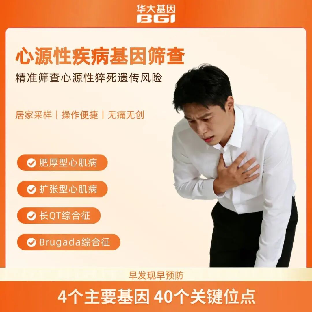 华大心源性疾病基因检测,聚焦引发心源性猝死的最常见的四种先天性心脏病及其主要相关基因,精准筛查心源性猝死的遗传风险,指导早期预防与干预。