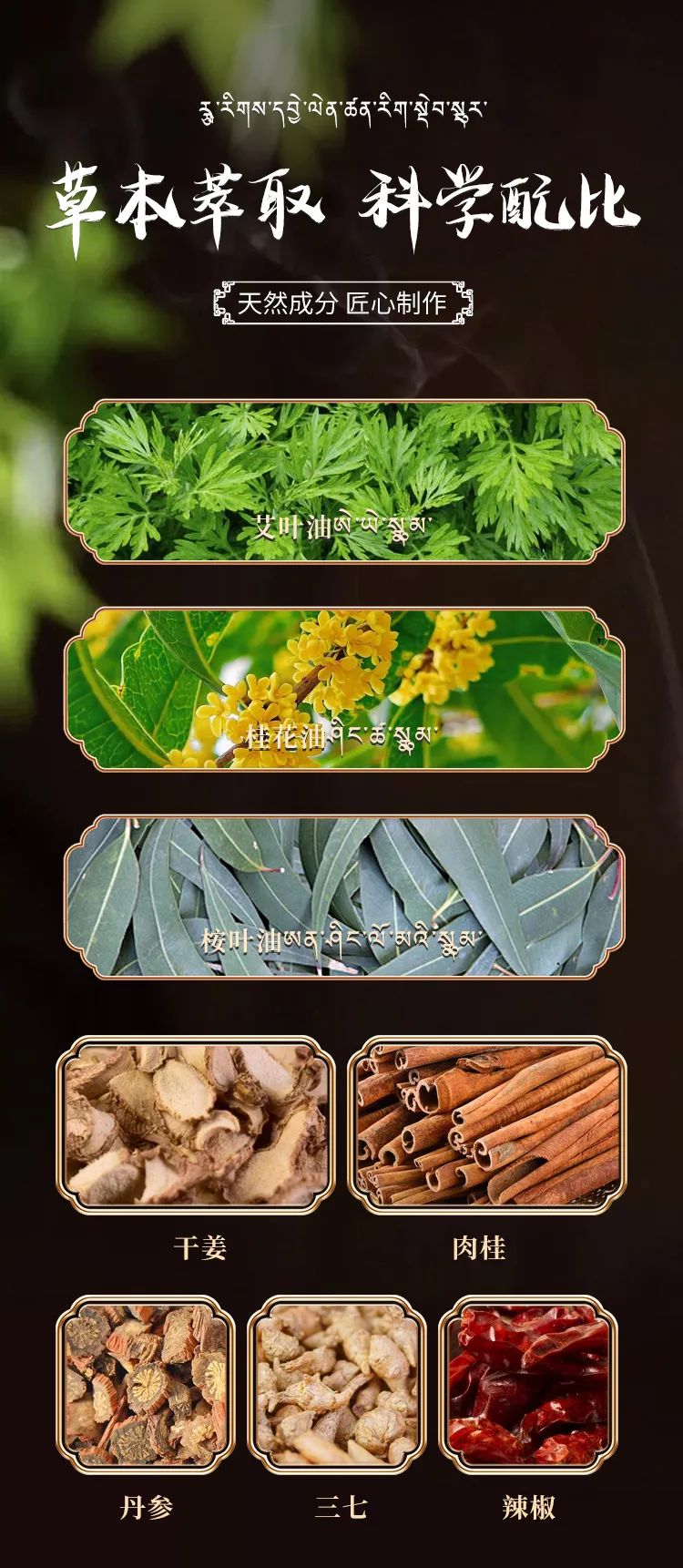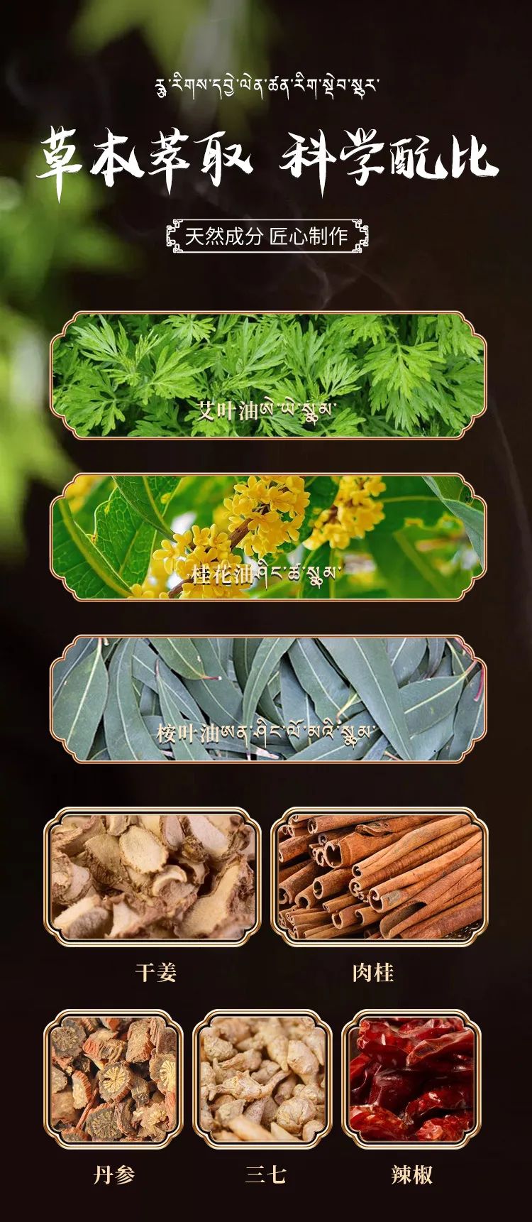 配方来自传统藏方,多种草本萃取科学配比:艾叶油、桂花油、桉叶油、干姜、肉桂、丹参、三七、辣椒。