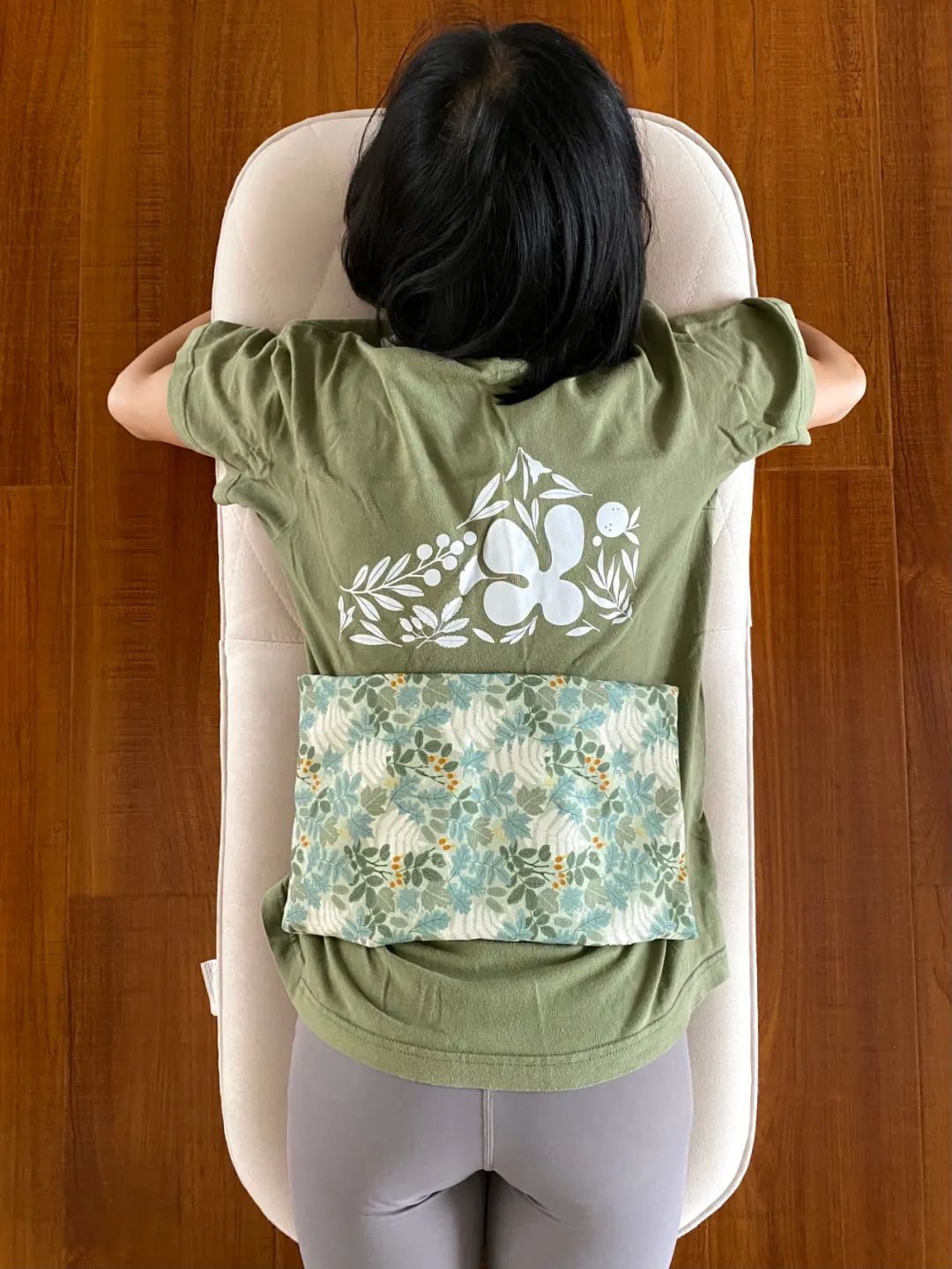 睡前采取趴着的姿势,敷一敷腰背部,让身体更好的放松: