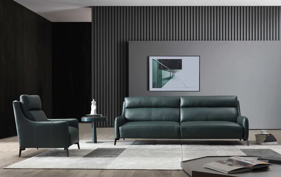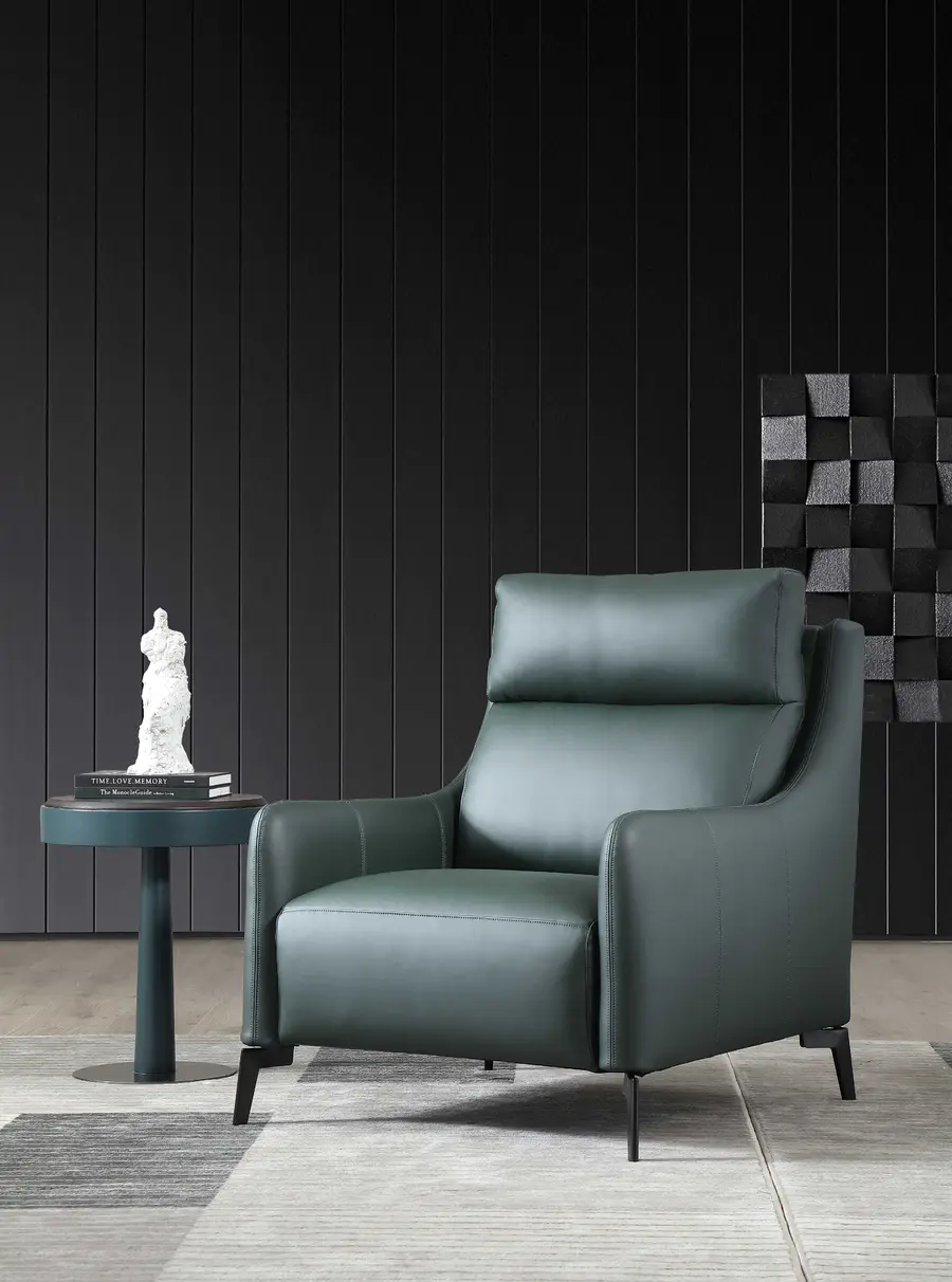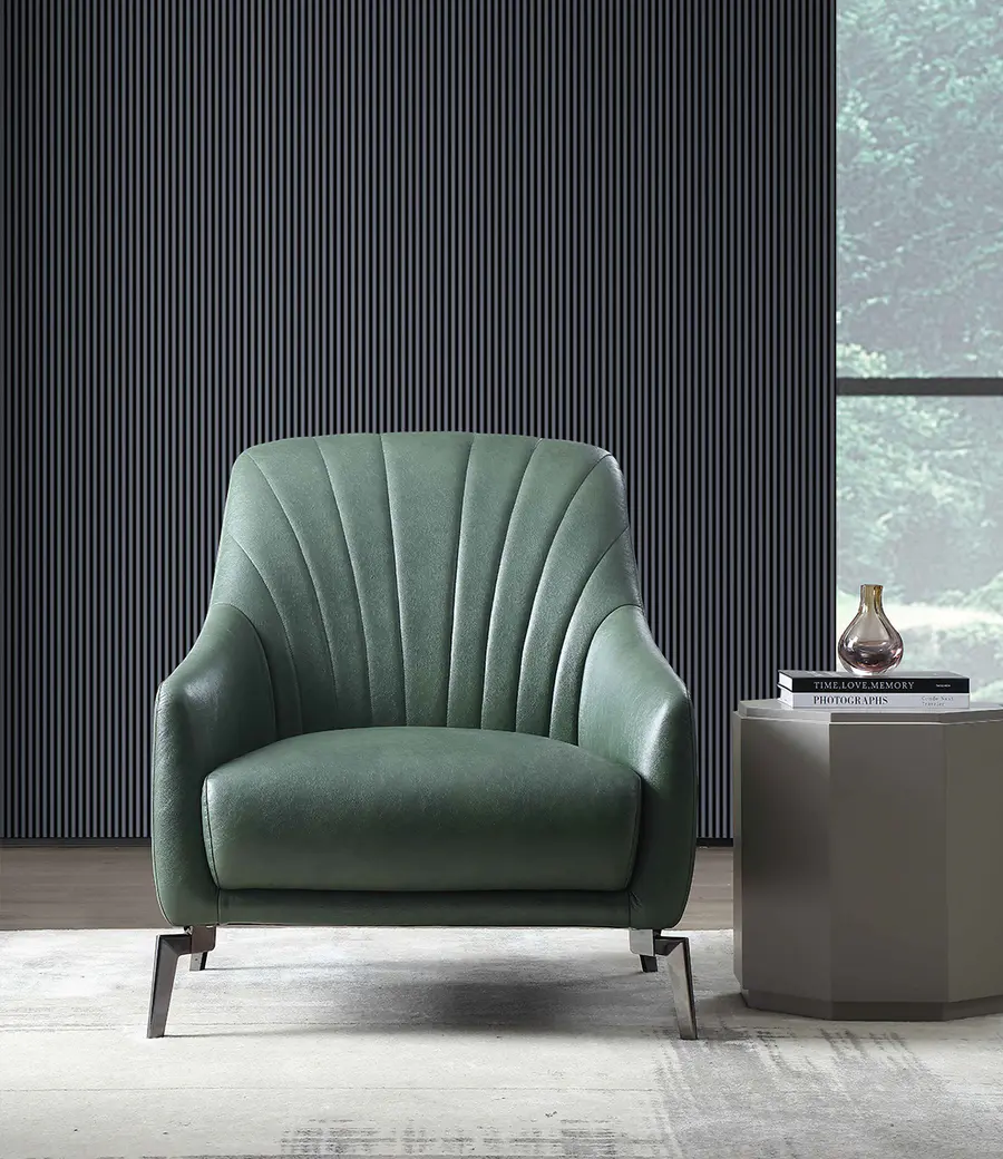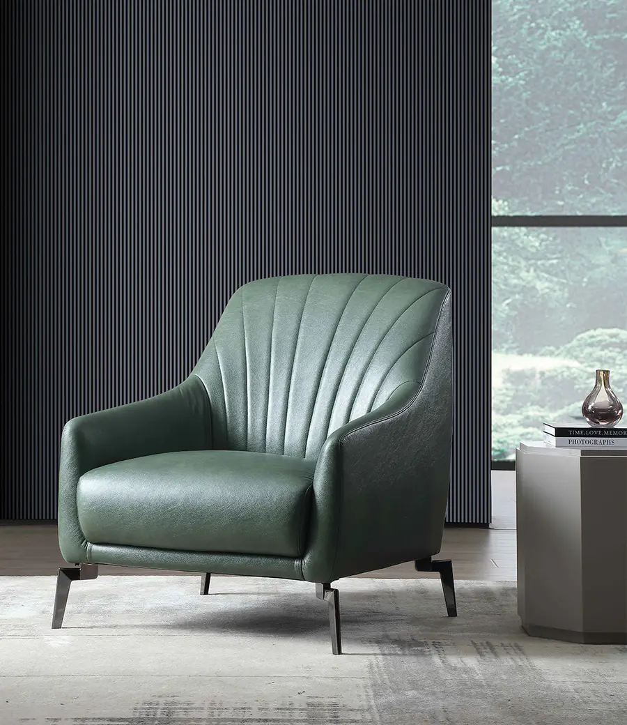 休闲椅略带绿色复古的设计元素,轻奢窄边扶手,给空间注入层次感。Slight八角形边几茶几组合让细节收纳更为贴心,独特的几何立体感,装饰与实用兼具共同营造时尚都市的空间氛围。