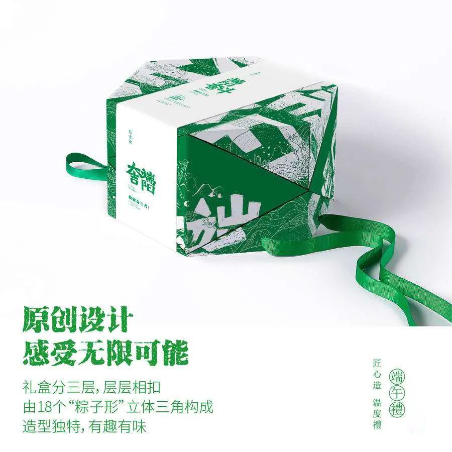 这一次,磨功夫以端阳之名,推出磨功夫严选致敬礼盒 / 端阳大吉,致敬每一位奋斗者。精良的食材,别致的设计,真挚的寓意,都在这份匠心独具的礼盒里。外包装优雅的绿白配色,还没打开,就已经收割了一大波好感。而内部,更是暗藏玄机。组合拼装的设计,解压玩味无限翻转的粽形空间;礼盒的主角——粽子,馅料丰富、口感弹糯;搭配生态孕育流油冒沙的咸香鸭蛋,强强组合,解决你的端午手信选择困难症。至于为何选择“奋斗主题”,是因为:这世上没有从天而降的英雄,有的都是挺身而出的凡人。我们都是自己首席的英雄,是生活的奋斗者!端阳大吉礼盒真的装着满满的创意与心意。礼盒内放置粽子的包装自身就是一款解压神器。还记得小时候玩的折纸游戏吗?这一次,我们一起重温童年的乐趣。六个粽形空间的无限翻转,治愈钢筋水泥里奋斗的灵魂。