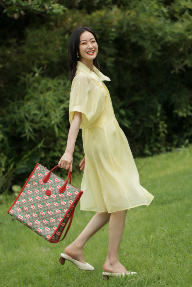 轻薄透气的茉莉黄蝴蝶袖连衣裙