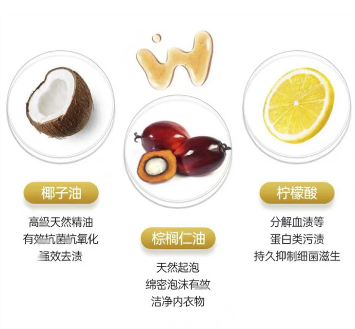 椰子油、棕榈仁、柠檬酸等去污成分