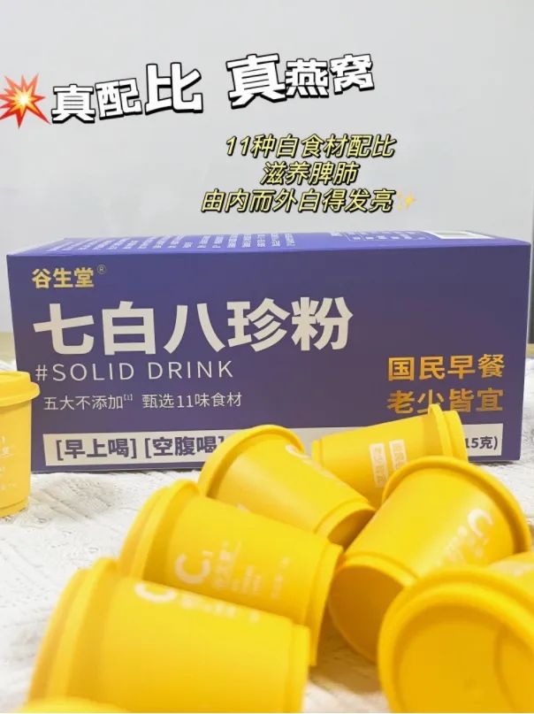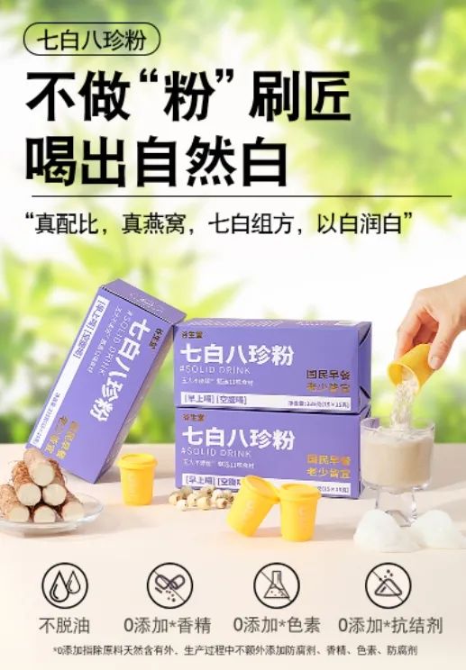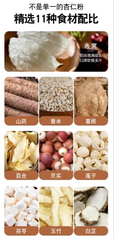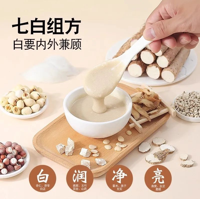在原来杏仁七白方子的基础上,融合了八珍粉的配方,添加了燕窝!薏米、玉竹和白芷。