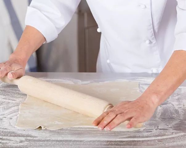 4、半个小时后,将面团取出擀成面片,撒上一层干面粉;