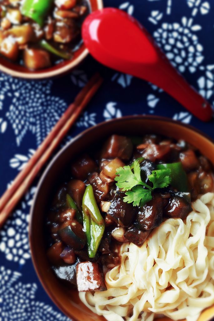 5、将卤汁倒入面条碗中,这碗茄子打卤面就做好了;